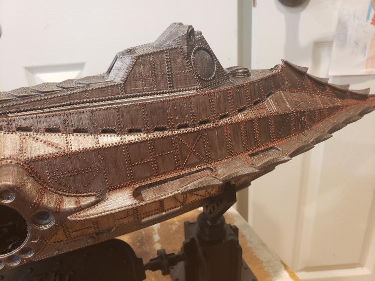 ID:	164728 Main sub assembled. Fabricated a new stand. Painted and started the weathering. I dusted some Dark Copper over the Dark Steel to tone it down, added a wash and rust on the rivets. Top starboard side almost finished!