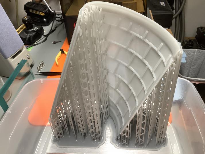 Slicing orientation needs to be a minimum of 45 degrees. This still leaves a large raft, but can that can be changed by increasing the tilt; I'll go as high as 60 degrees before the ribs start needing too much support. Anyway, manually attaching heavy supports to my rib junctions works well, and I throw a lot of supports at the corners and leading edges of the hull sections. Using lattice support structures intertwined in hexoganal patterns (on the Z axis) gives dependably rigid supports.