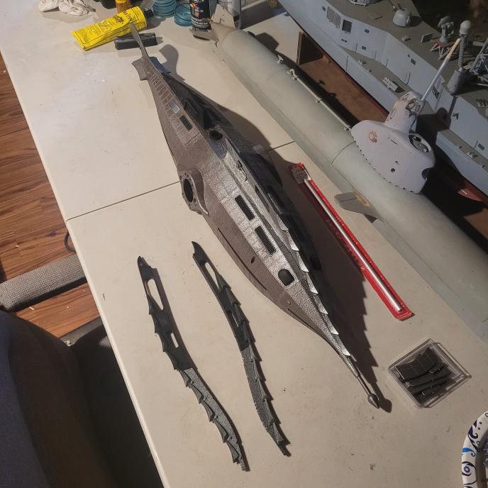Been more than a few busy days, but I got some work done over the last 2 on the Nautilus. So the scale works out to be 1:63 with the 60% scale of the model parts in Lychee. I have been using a syringe with the elegoo resin in it, and a UV flashlight to fill in any small gaps left after gluing the rakes and the keel in. I am using spot and glazing putty on areas that the resin will just flow through.