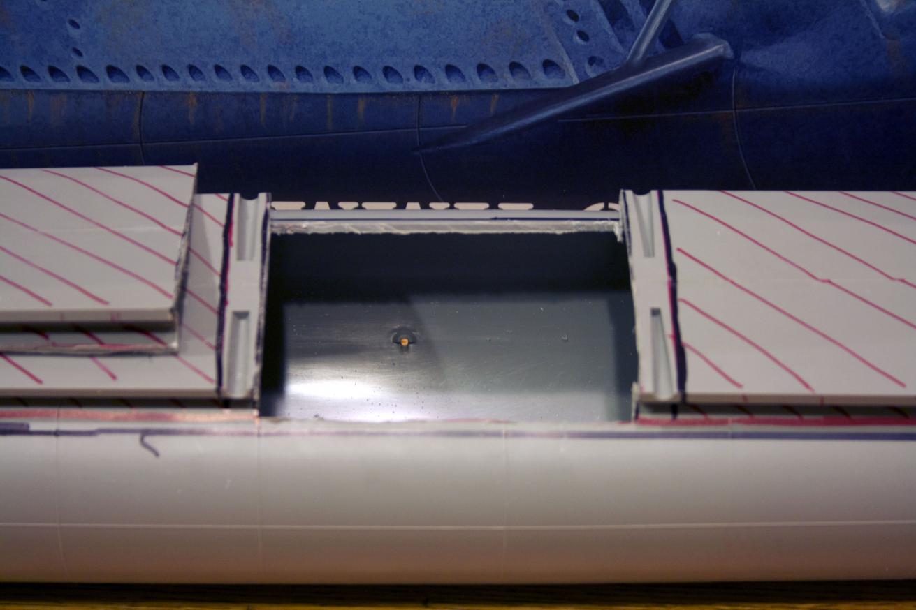 The next challenge is fitting the wtc into the hull. I made a paper template (Dave, is the wtc really 30” long!?!) to see how it would slide in, not much wiggle room.