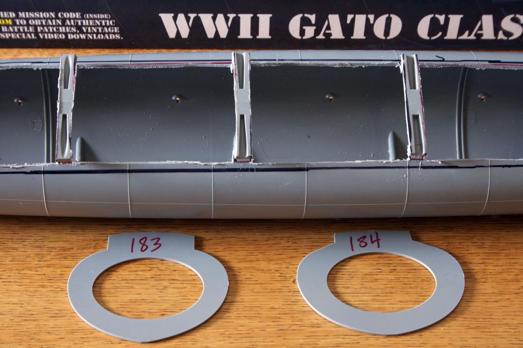 Since I decided I am not going to cut my hull in half, I need to reinforce the bulkheads. I purchased garolite and used parts 183 and 184 as a template.