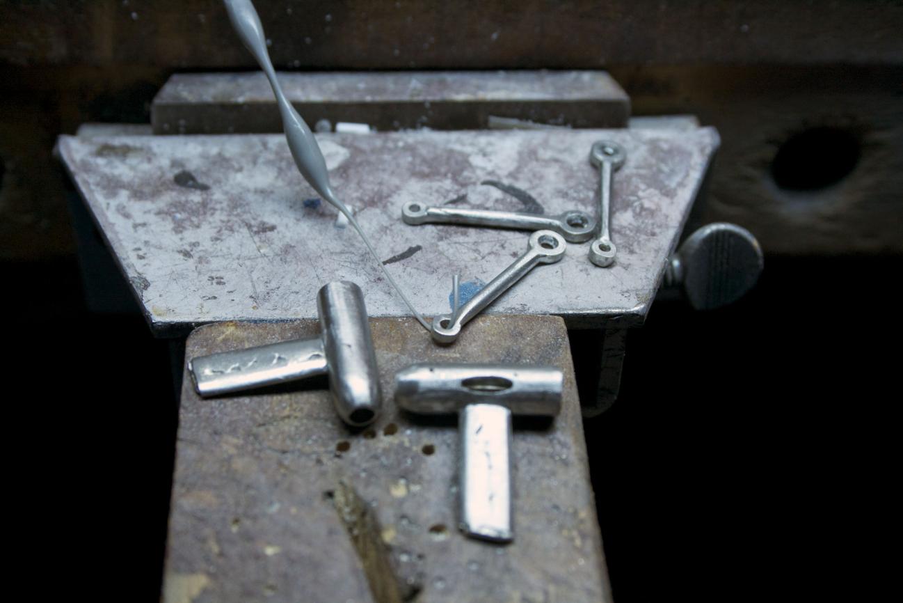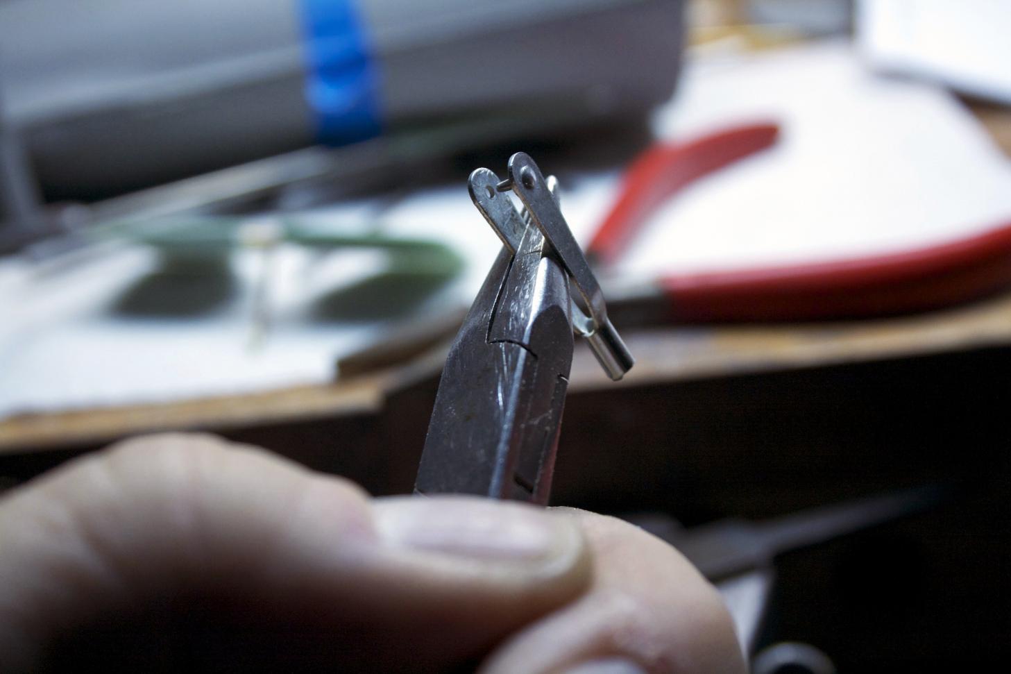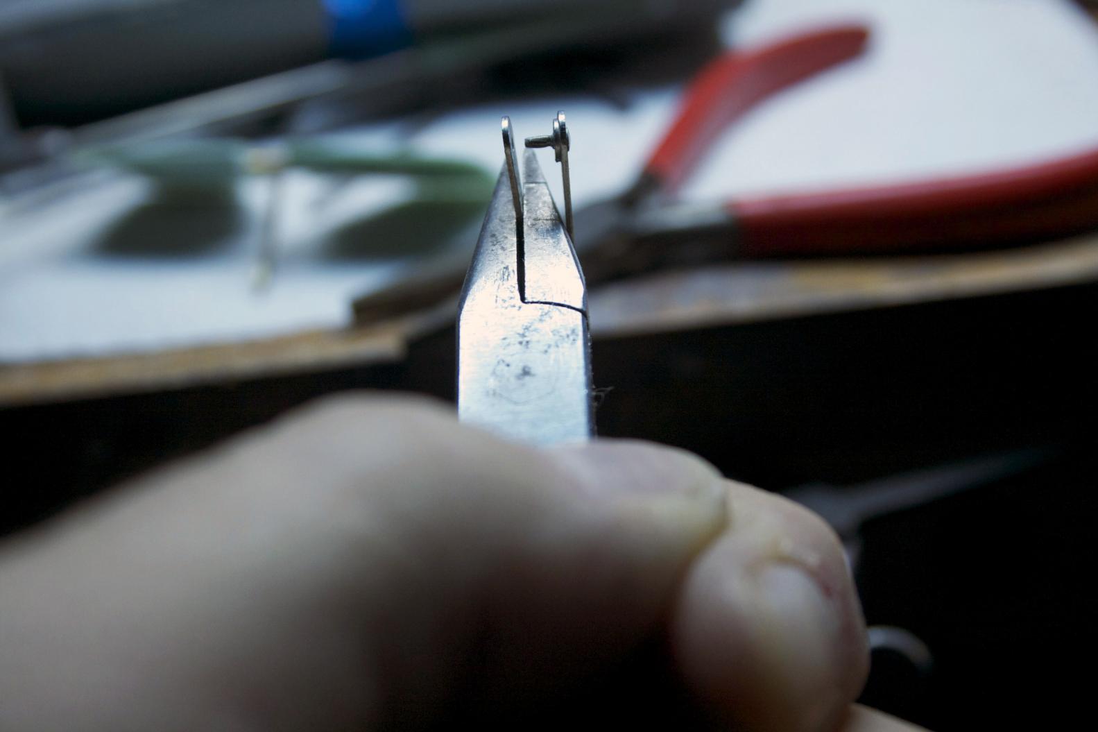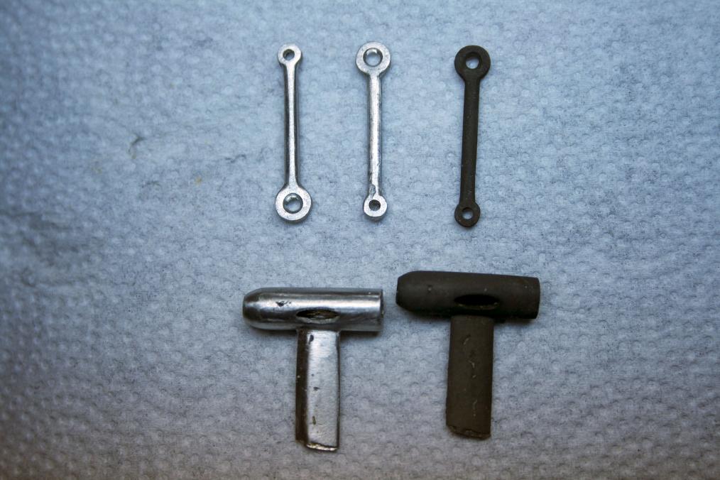 The aft planes needed a clevis attached to it. It took me a while to find one that I could solder to 1/16” brass rod. I brought them (two in a pack), but the pin was too big to go through the dive plane control arm hole. And if I tried to drill it out, there would not be any metal left to create a hole. So, the logical thing to do (in my mind) was to make the pin smaller. Oh by the way, if you pull a clevis too far apart it goes “Sprongg” and flies apart. So I began attacking the pin on the one clevis I had left. Gently worked around the pin with a file until the diameter fit the control arm hole.