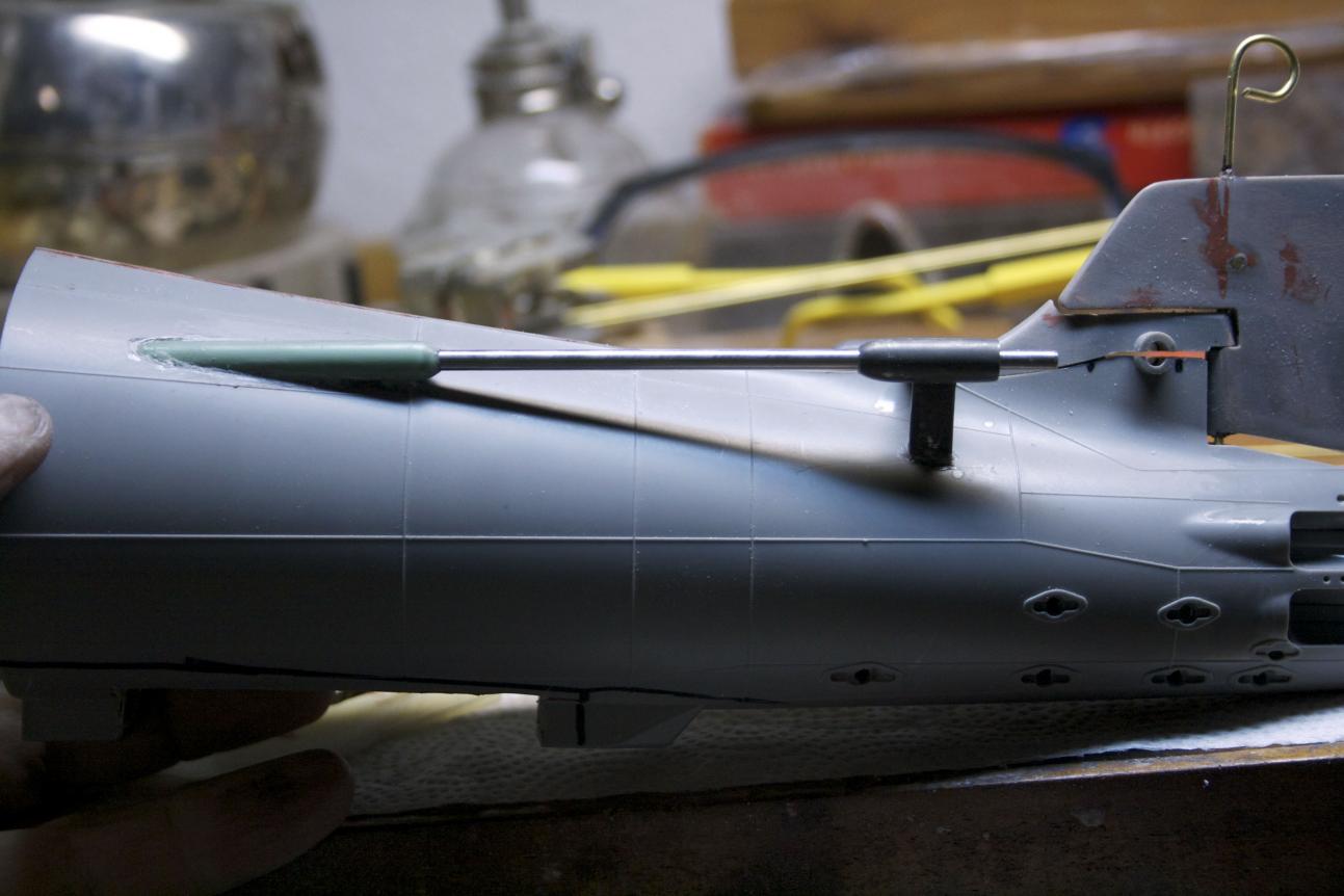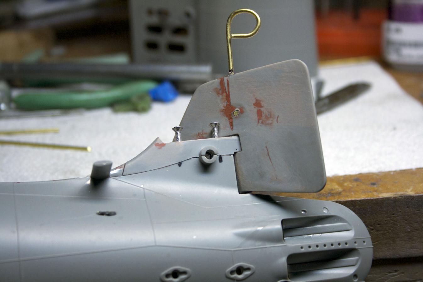 I also cut a flat surface on the rudder shaft for the control horn’s set screw. You might be able to see it through the aft torpedo opening.