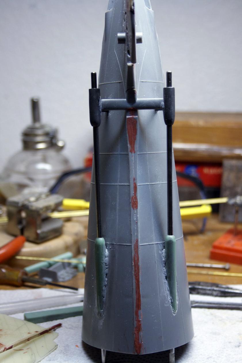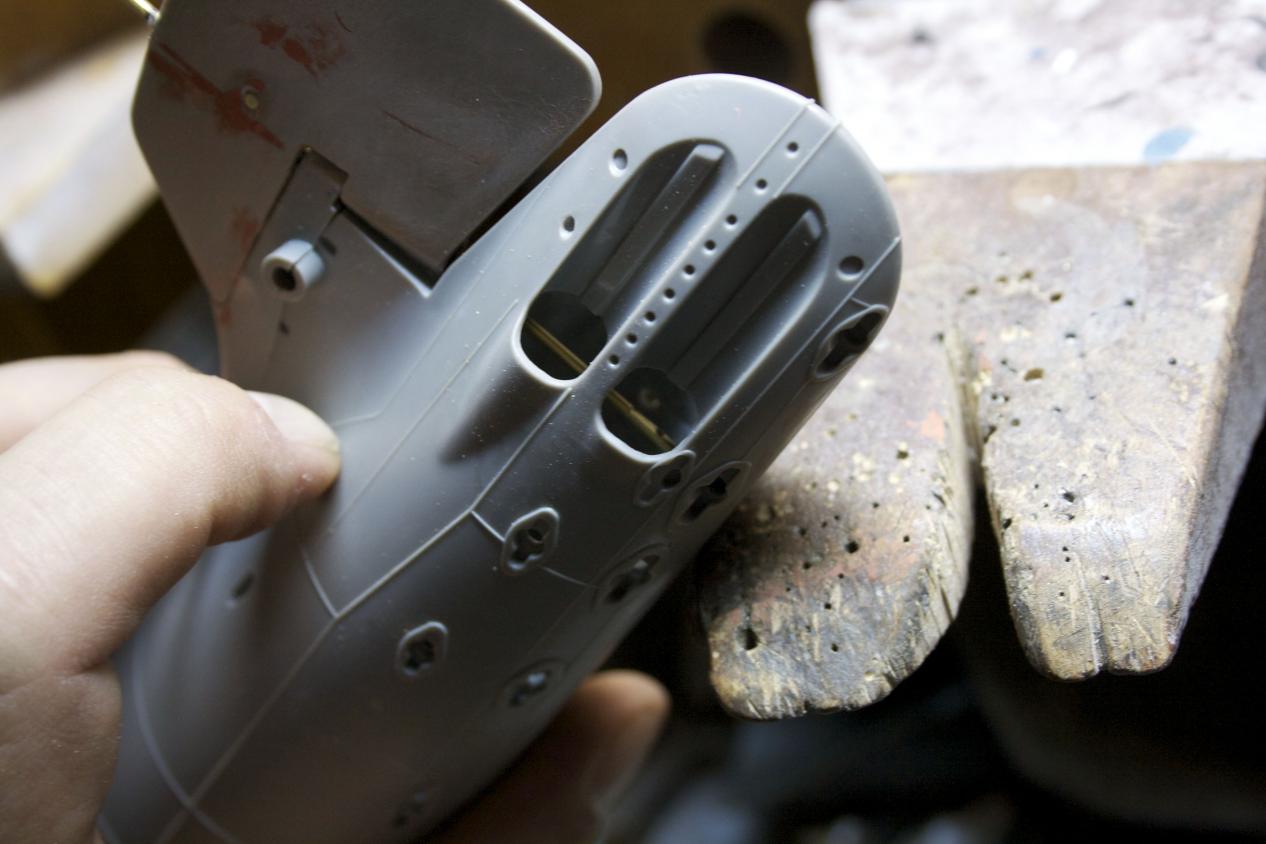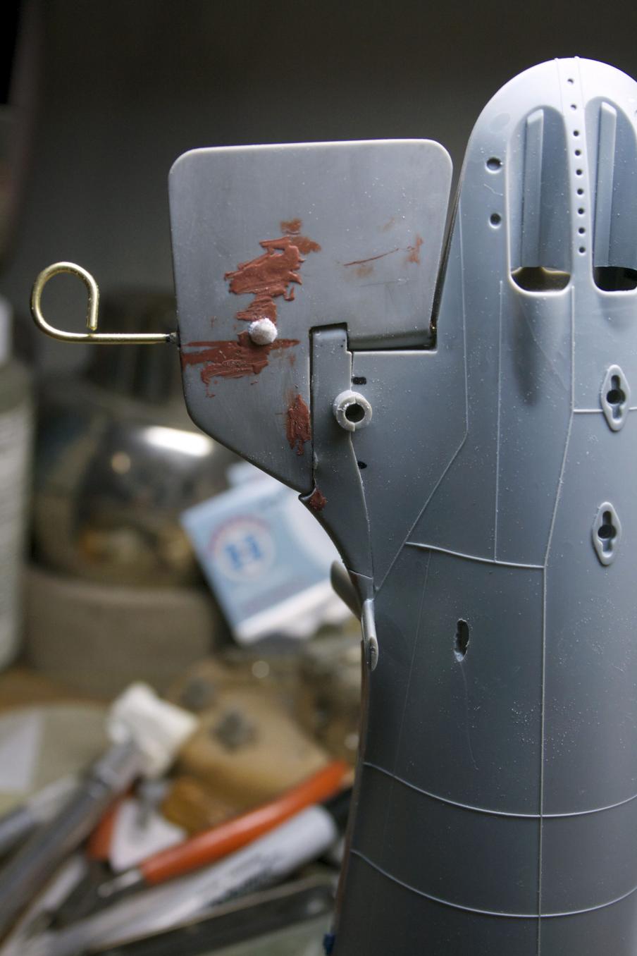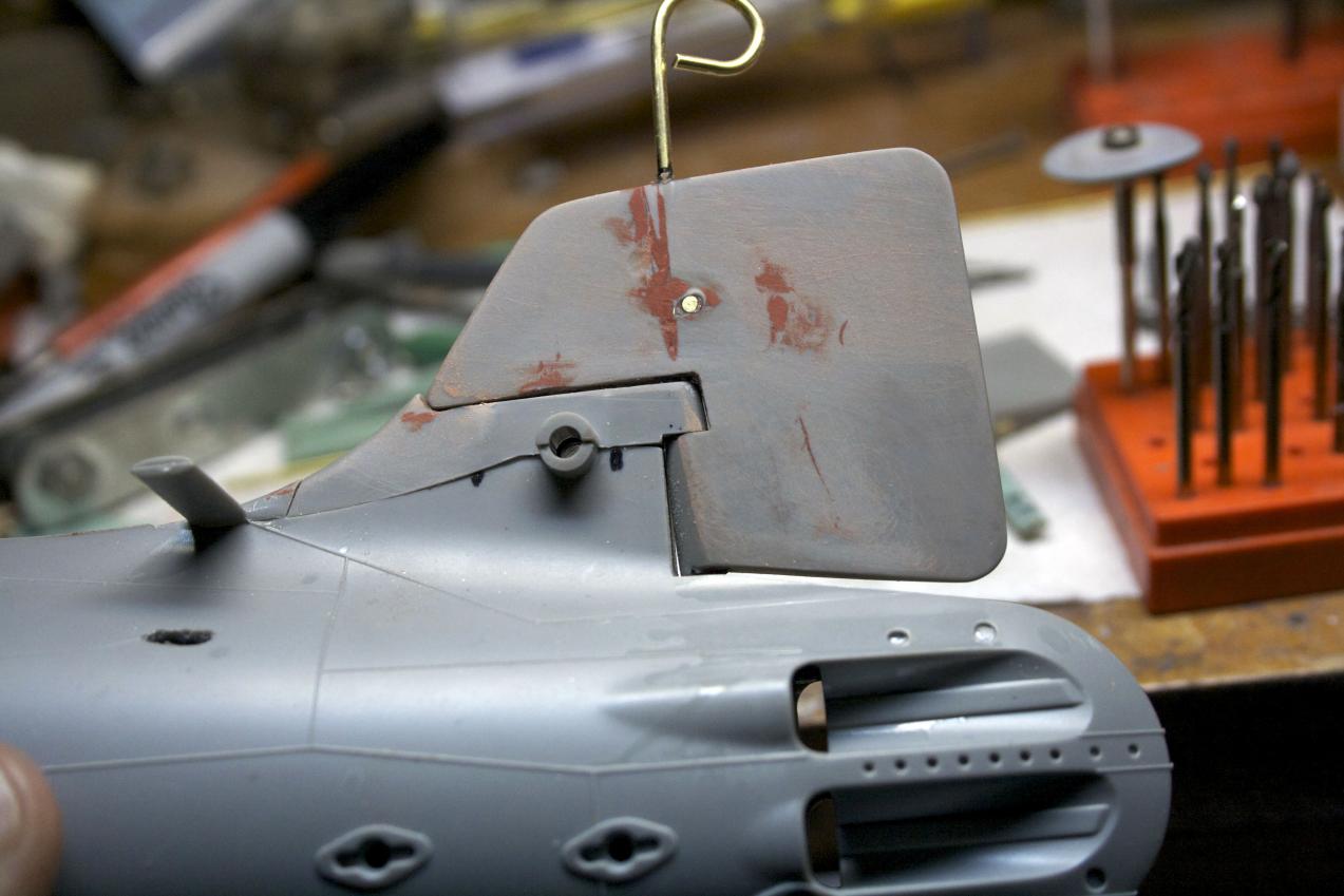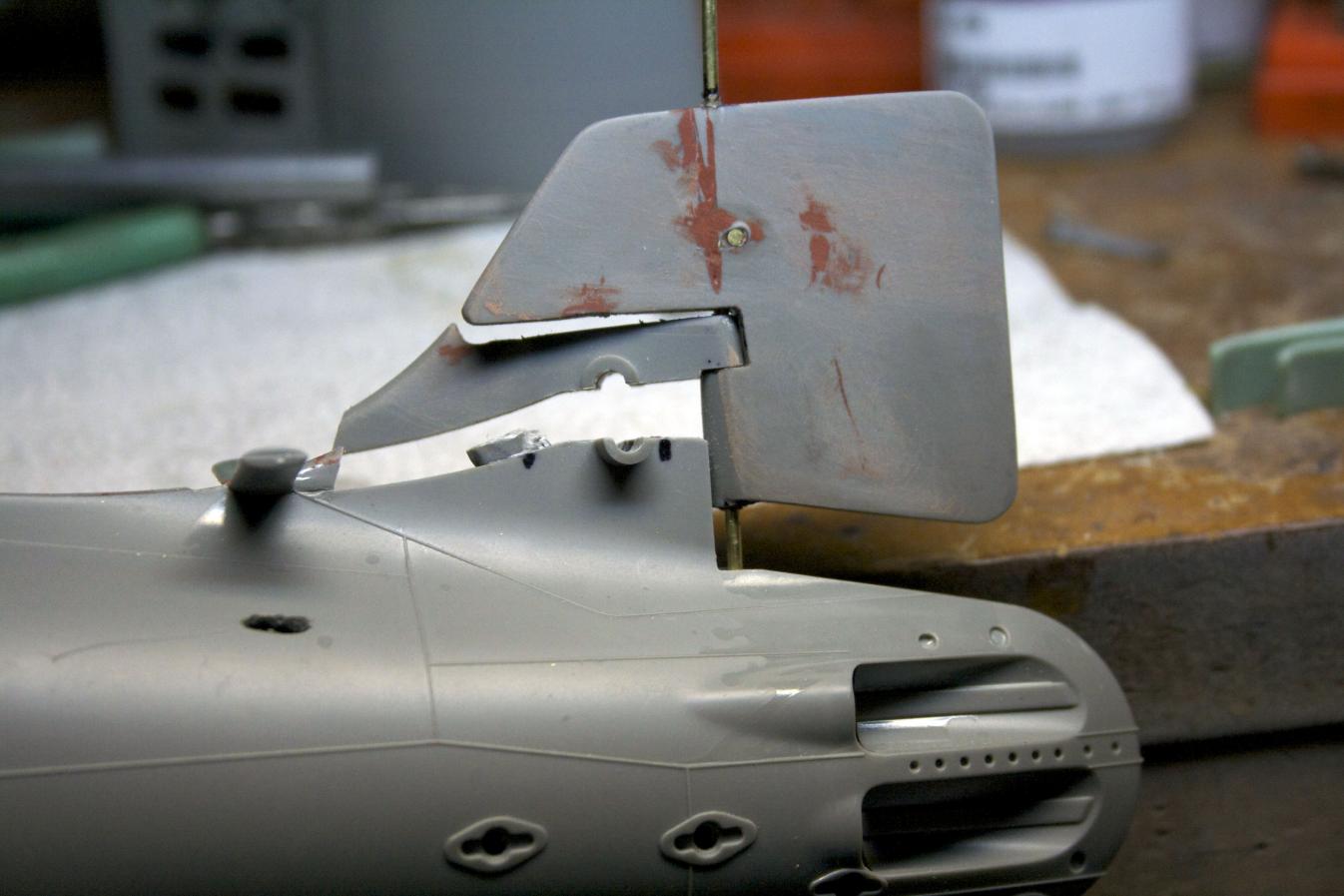 I will make a correction to a prior post, I would need to either make the sprue/screw/skag filler longer and NOT cut the front at an angle or cut it to this height and cut the front at an angle. As it is, there is just enough play with the skag and rudder to get over the sprue filler. Had I made it taller, there would be another shame picture to show as I try to cut the sprue filler off.