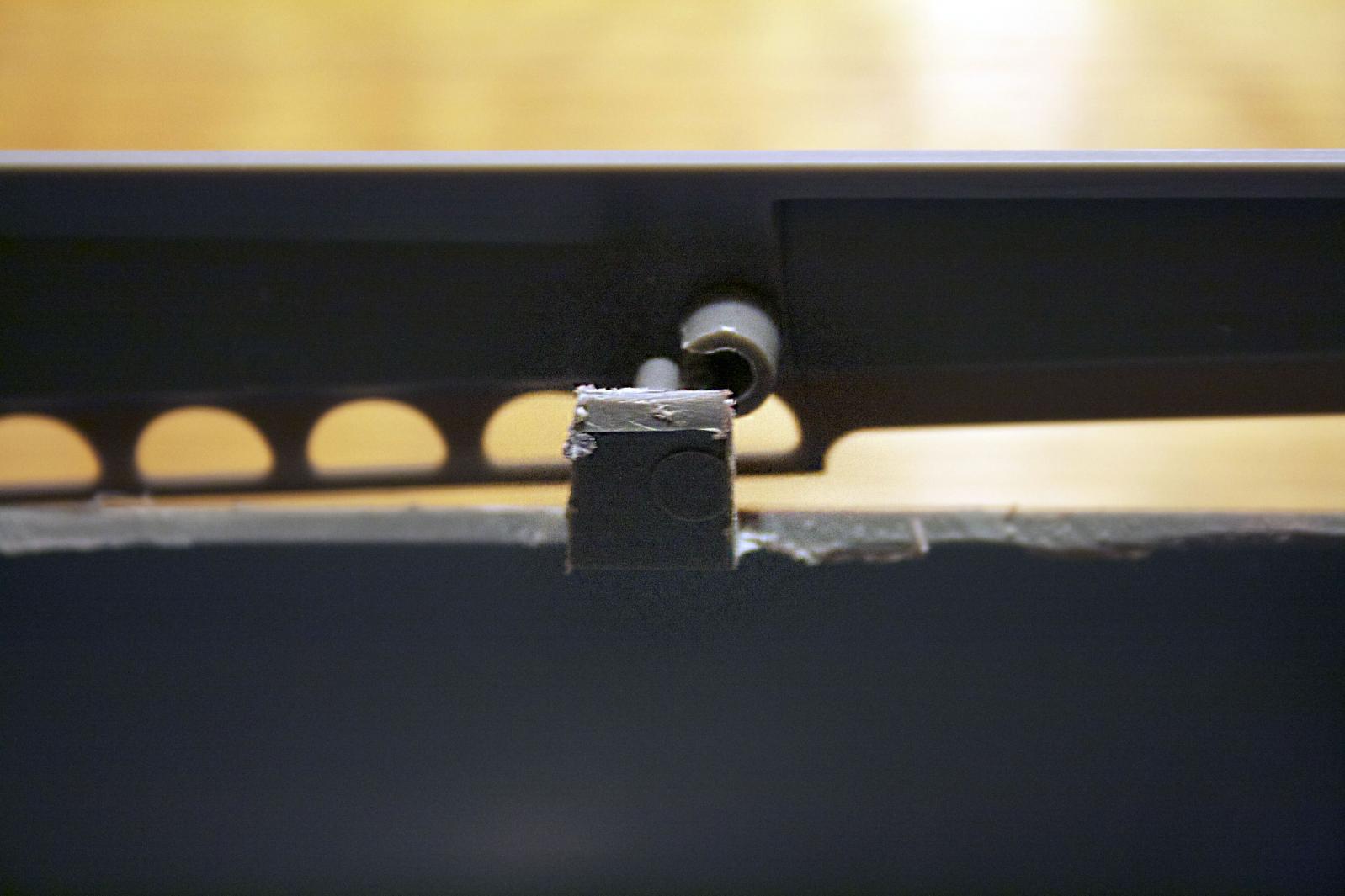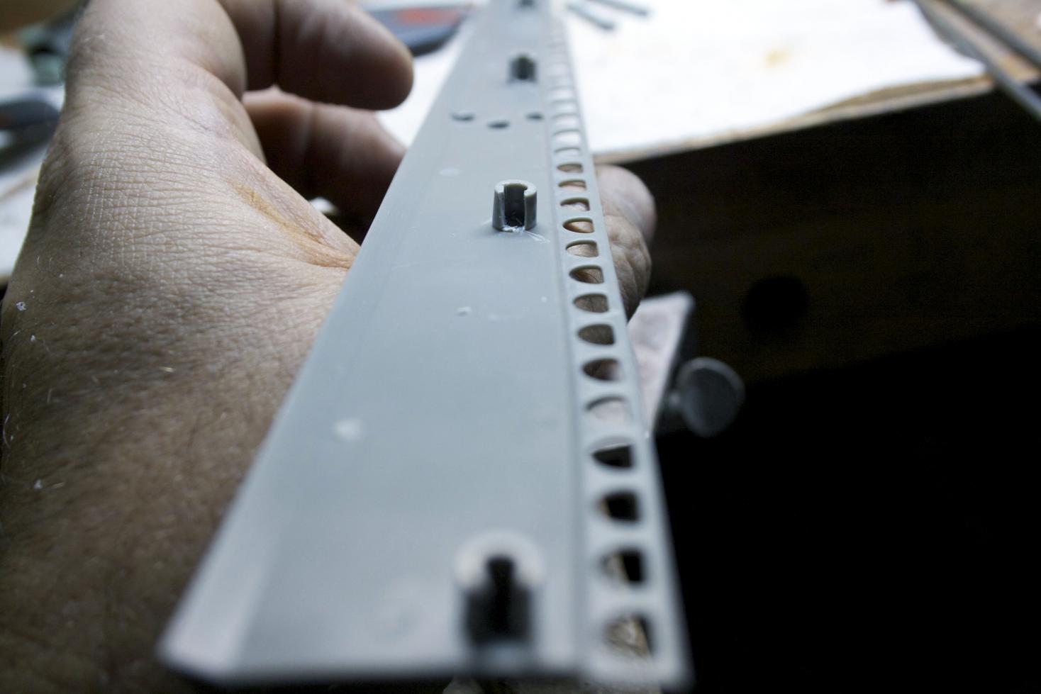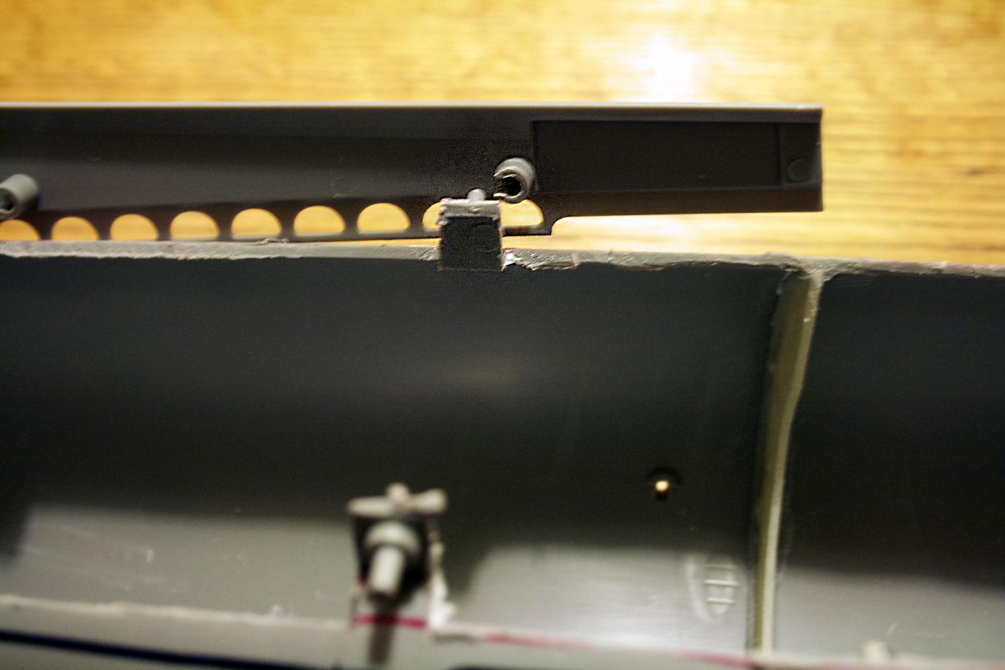 So time to add the front vent plates. Before I could glue them, I needed to remove the forward portion of the pin receptacles. I want to be able to slide the deck forward and have several areas engage to hold the deck down. So I drilled, cut, shaped, trimmed, and tested the cutouts to the corresponding pins until with a small amount of resistance it slid in.