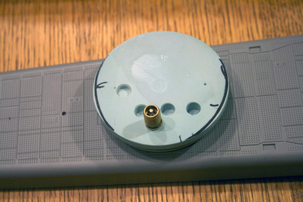 Then beveled the edge. The little bit of shaping I did, to account for the curve of the hull, made a big difference in distance or range of travel forward. There are two vertical lines the one to the left is without doing any shaping. The line on the right is from placing a bevel around the edge. The lip is about 1/8" and I trimmed it down to 1/16" or half way and tapered towards the center of the cap about 3/32" to 1/8" depending on where the hull contacted the end cap the most.