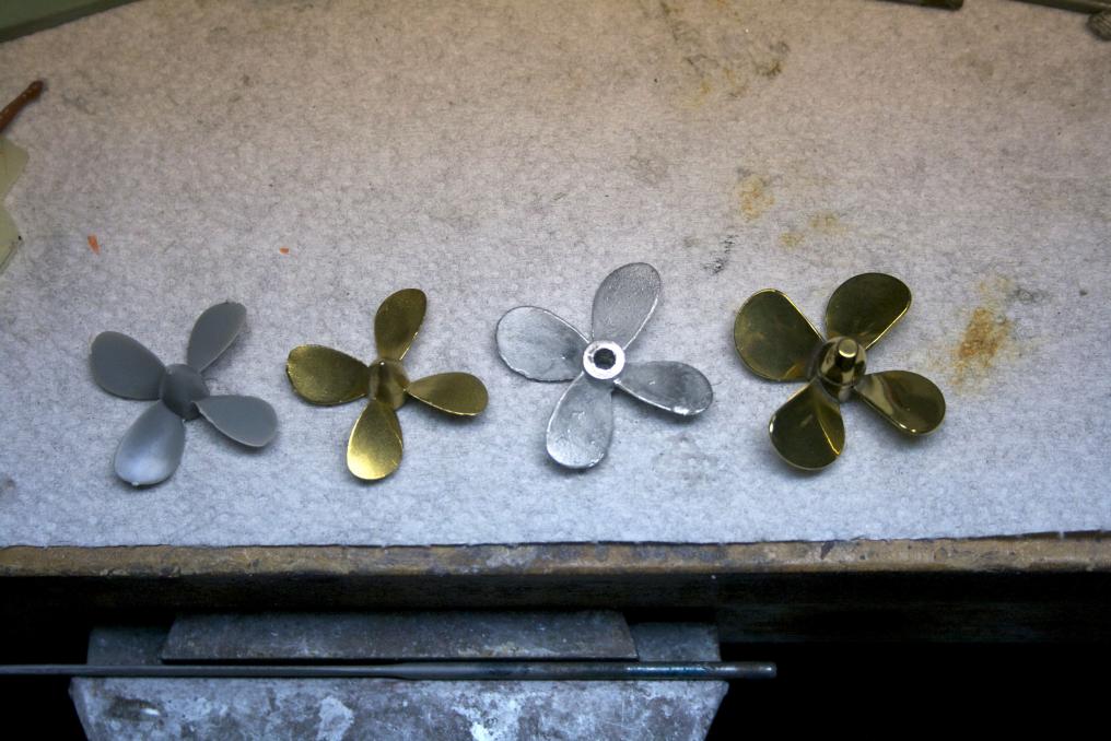 Got a moment? Lets talk about props. Here is a selection of props for the Gato. The plastic kit one measuring 32 mm, a brass prop that I got when I purchased a gentleman’s wtc and assorted pieces measuring 31.5 mm (looks like they just cast the model’s prop), a D&E white metal prop measuring just a hair short of 35mm looks like it is 34.9 mm, and finally a Raboesch prop (purchased from Caswell Inc.) measuring about 35 mm maybe the same as D&E. So which one is more scale like or does scale really matter here? Does the larger blade on the prop help performance? What are your thoughts?