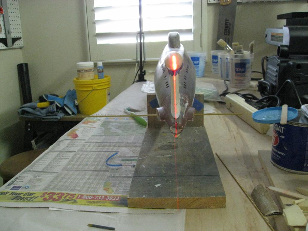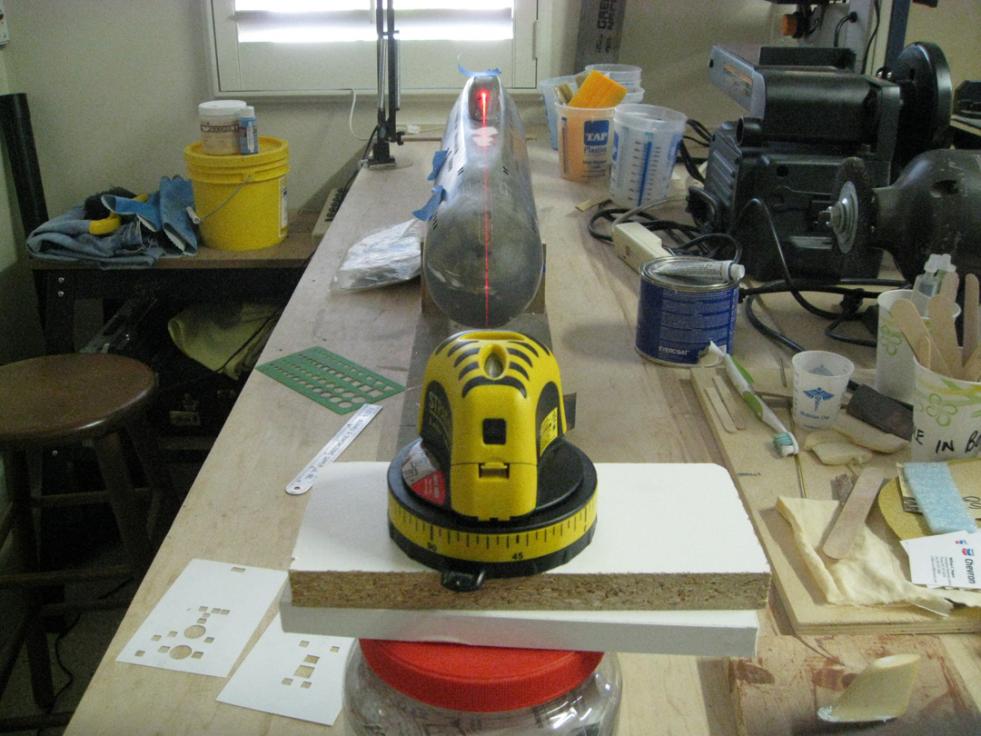 In this post I show a photo using my laser level to check alignment of the rudder and stern planes. The laser level has been very helpful in this and other important alignment tasks such as establishing and maintaining a centerline on the hull as the work progresses. I’ve marked the centerline with a Sharpie and sometimes have driven in finishing nails along the line to maintain it. The nails can be removed and the holes filled as the project nears completion.