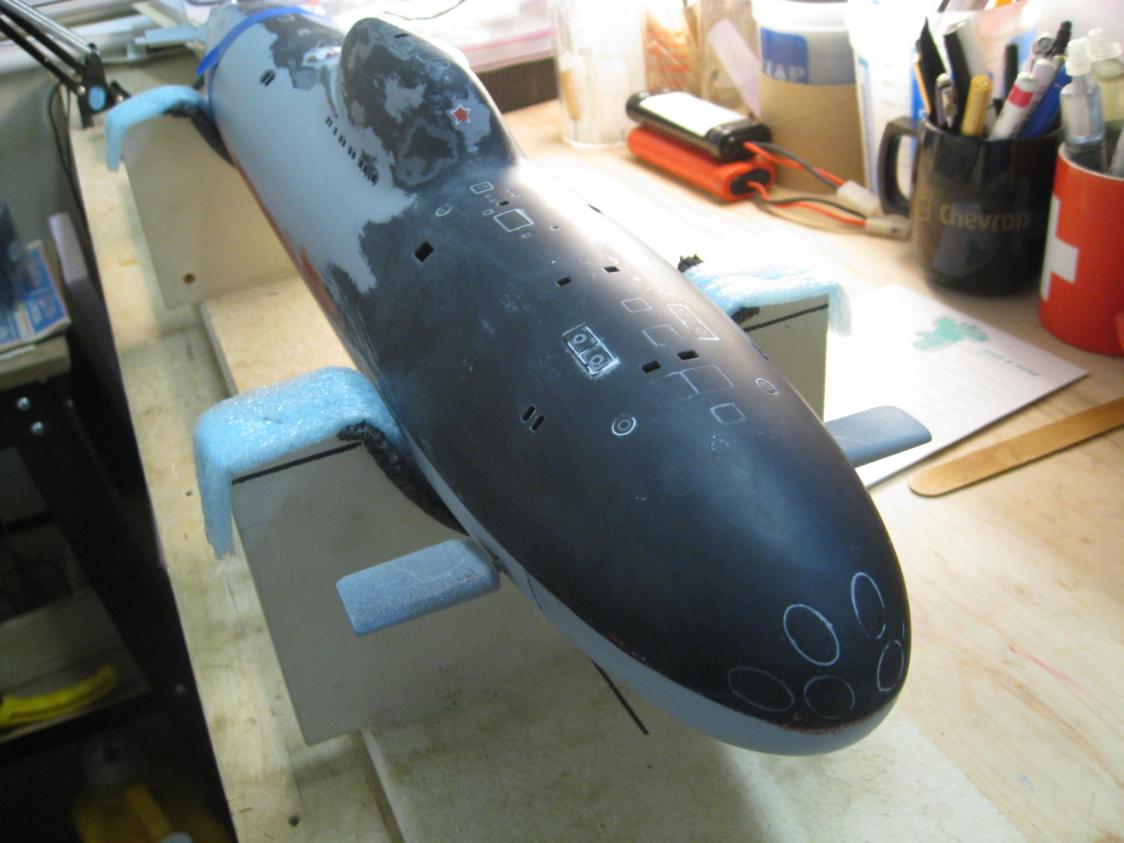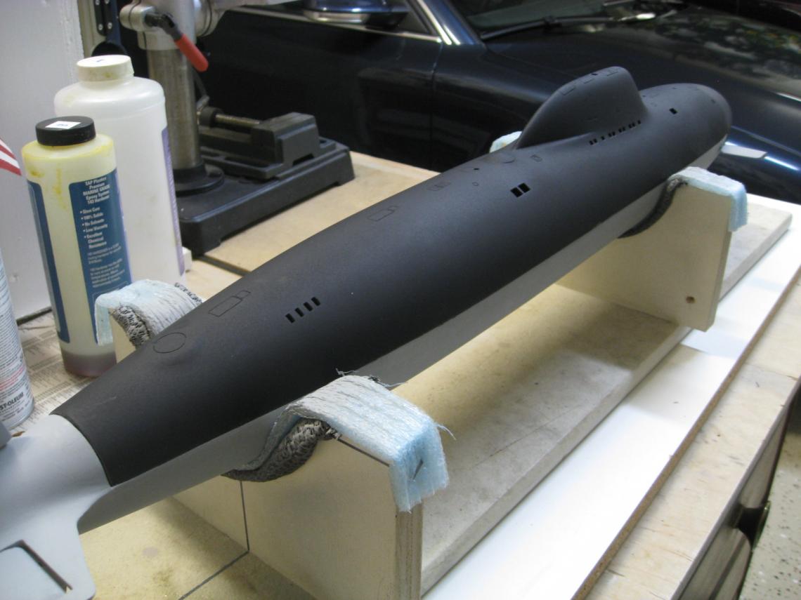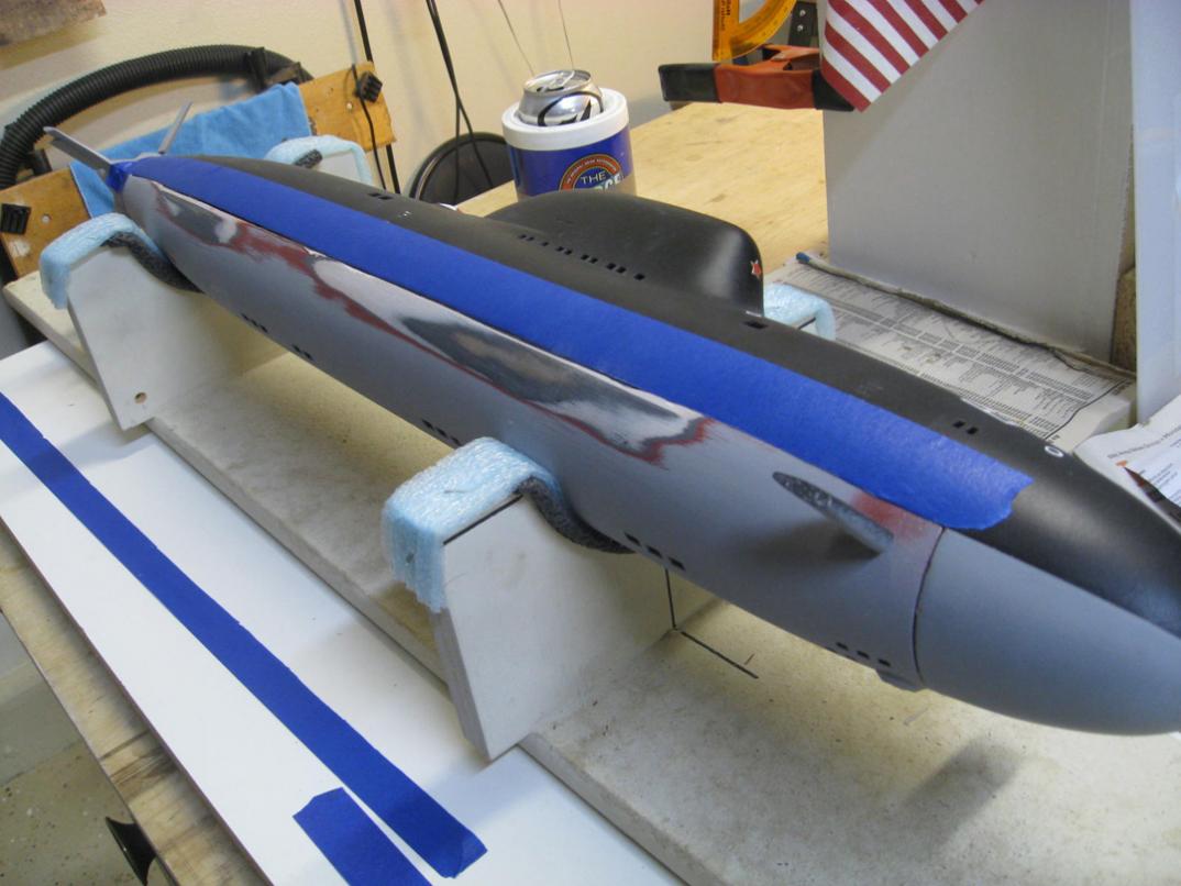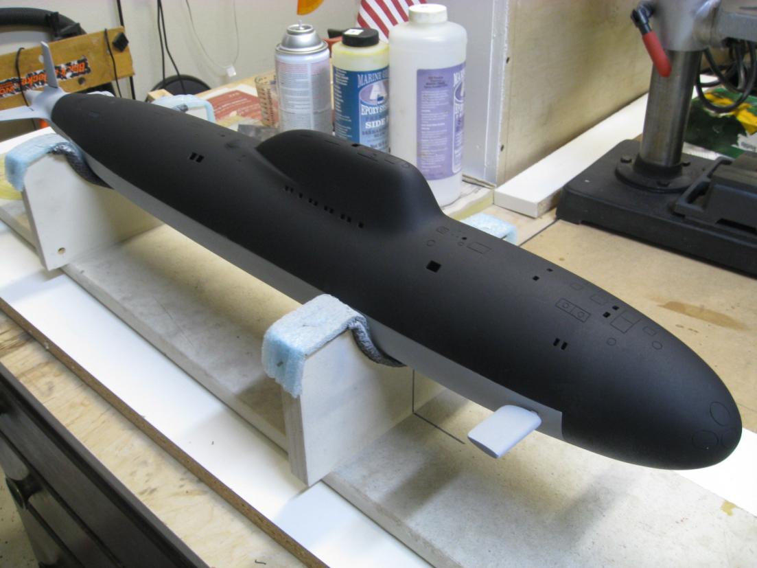 It reminded me of a visit I made to the submarine base at Pearl Harbor in 1980. The boats I saw docked there were a very threatening looking flat black. At that time I knew very little about modern day subs and I never did learn the names of the ones I saw although I assume they were attack subs. Anyhow, I decided to use a satin black enamel instead and dull it down later with a flat clear coat. Seems like every time I touched the flat black it left a scuff mark.