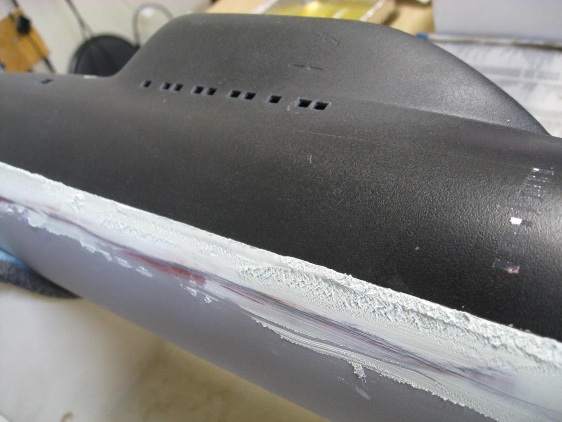 So, I filled in the gap as shown below using blue tape and petroleum jelly to mask the hull. After spreading the filler I let it cure for a few minutes then pulled back the tape while it was still a bit soft. It looks like a nice clean fit but we’ll see if it stays that way. I guess that’s the downside of polyester resin hulls.