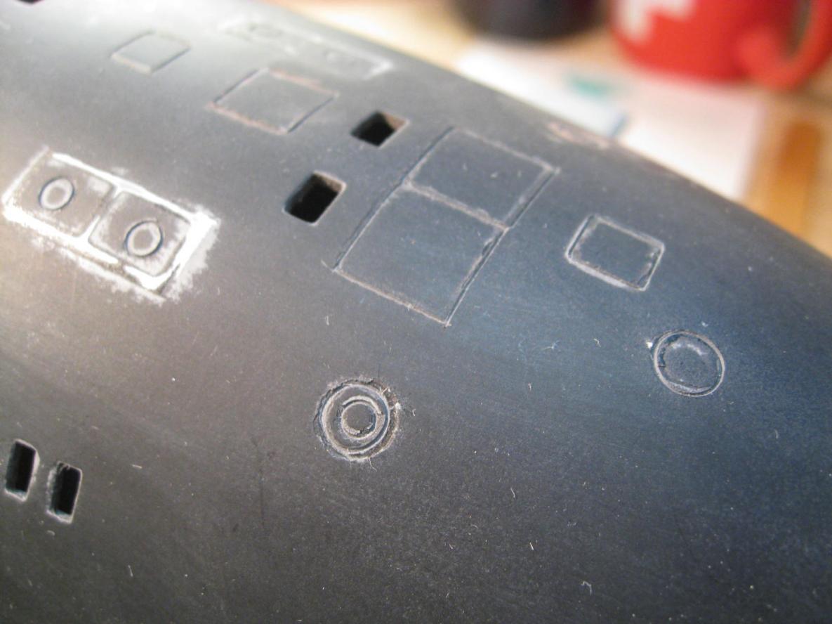 I’m still playing around with the joint between the upper and lower hull but I’ll eventually get to a point where I’m happy with it. For now I’ll set that work aside and cover some of the scribing work I’ve done. The first two pictures show the condition of the upper hull after I removed all the primer and clear coat using lacquer thinner.