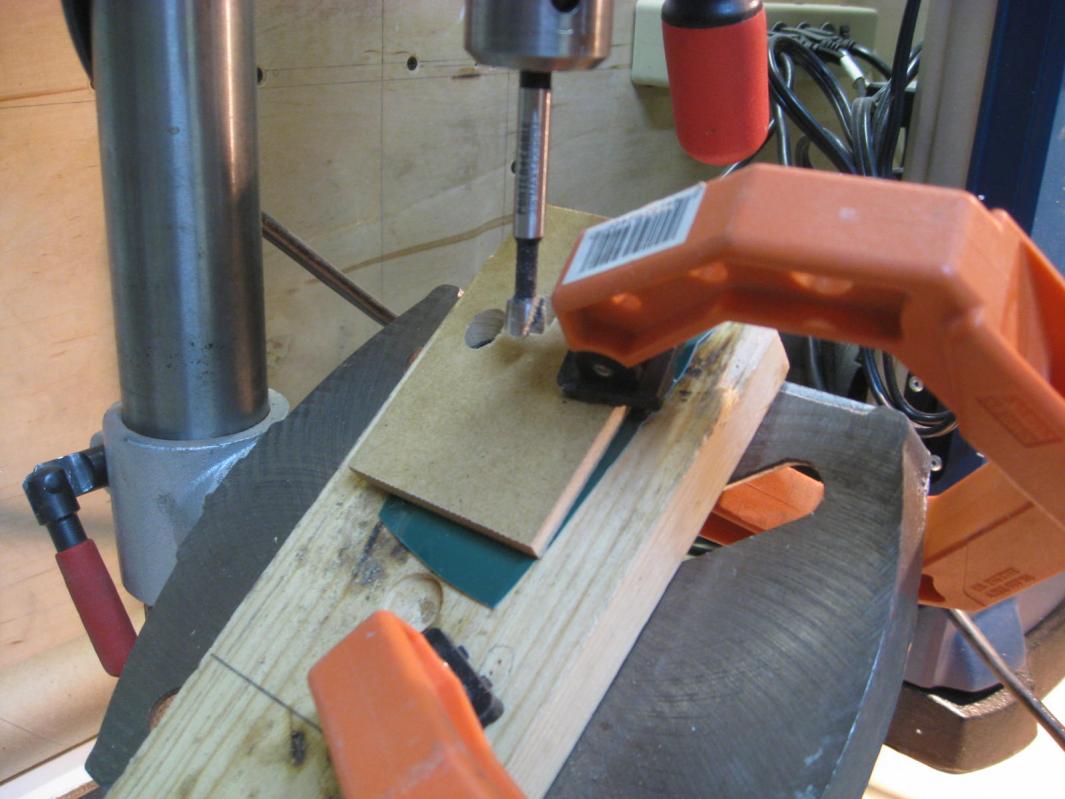 I needed an ellipse template for the torpedo doors but didn’t have that fit so I experimented a bit. After several trials I found a way to produce a reasonably good template using a piece of plastic cup sandwiched between two pieces of wood and cut at different angles on the drill press.