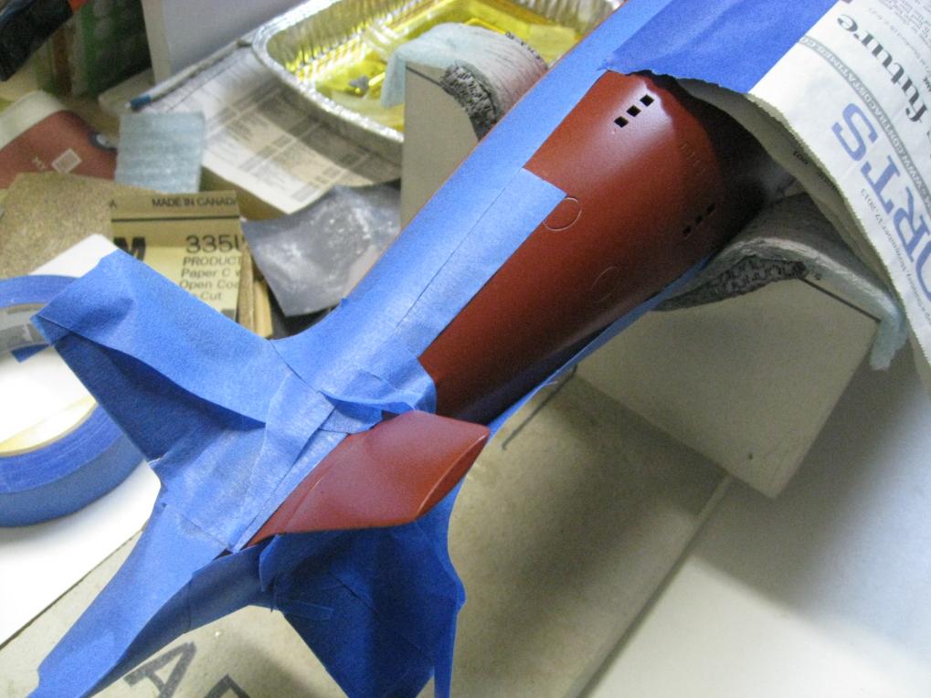 After painting the lower hull I wet sanded the upper hull with 320 grit, then masked the lower hull using blue painter’s tape and newspaper.