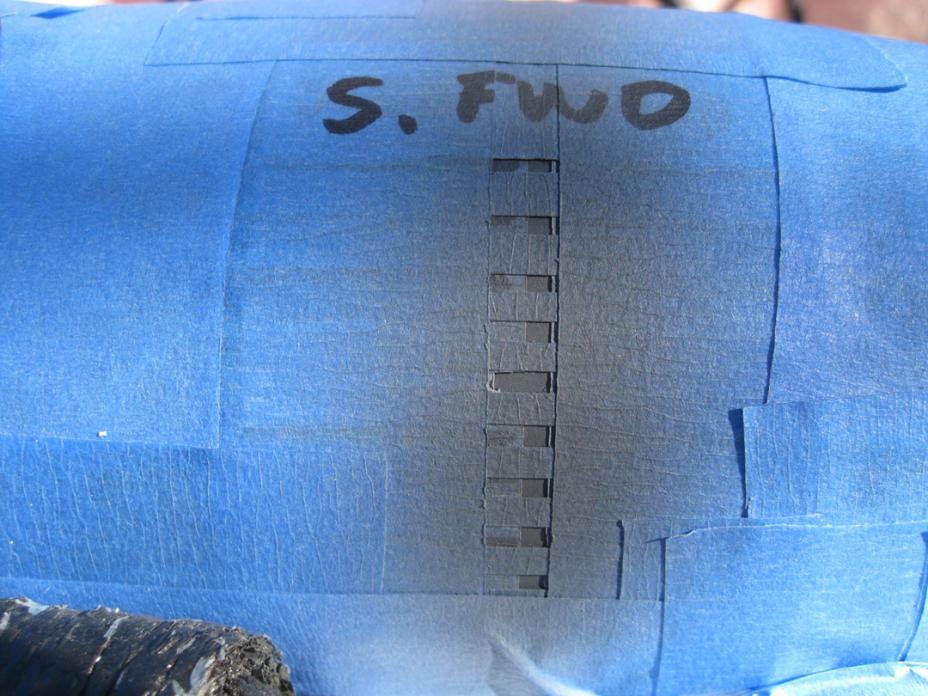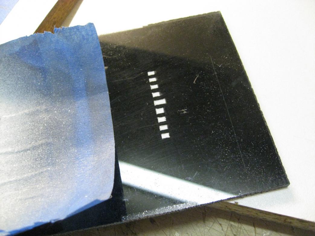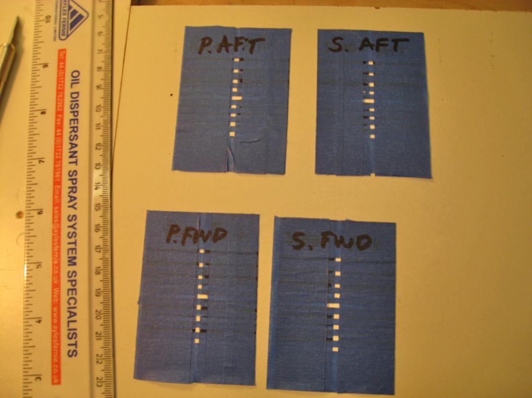 I’ve spent several days testing ways to do the draft marks. Greg Sharpe’s Alfa drawing was 1:72 scale, my model is 1:96 scale. I made a photocopy of the Greg’s marks and reduced them to 75%. At 1:96 they measure 1 mm by 2.5 mm and 1 mm by 4 mm – that’s darn hard to work with, especially when you need 4 identical sets. Here are some examples of templates I made. I hope to be able to use one template for all 4 sets. Using a piece of plastic painted black I did some testing. The white bled though as you can see so I’m doing a second test of the same template, this time airbrushing black first to seal the tapes. When that’s dry I’ll airbrush white and keep my fingers crossed.