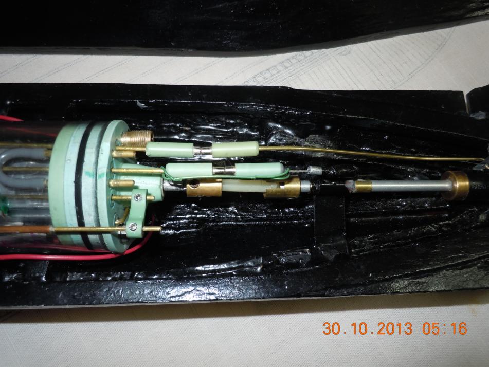 The boat is made of wood, epoxy sealed/painted. metal inserts reinforce critical features of the boat. For main ballasts, two rods disguised as torpedoes slung under the hull does the job. Sliding it fore or aft balances the boat. Final buoyancy adjustment is by small pieces of metals held by magnet inside the forward lower hull.