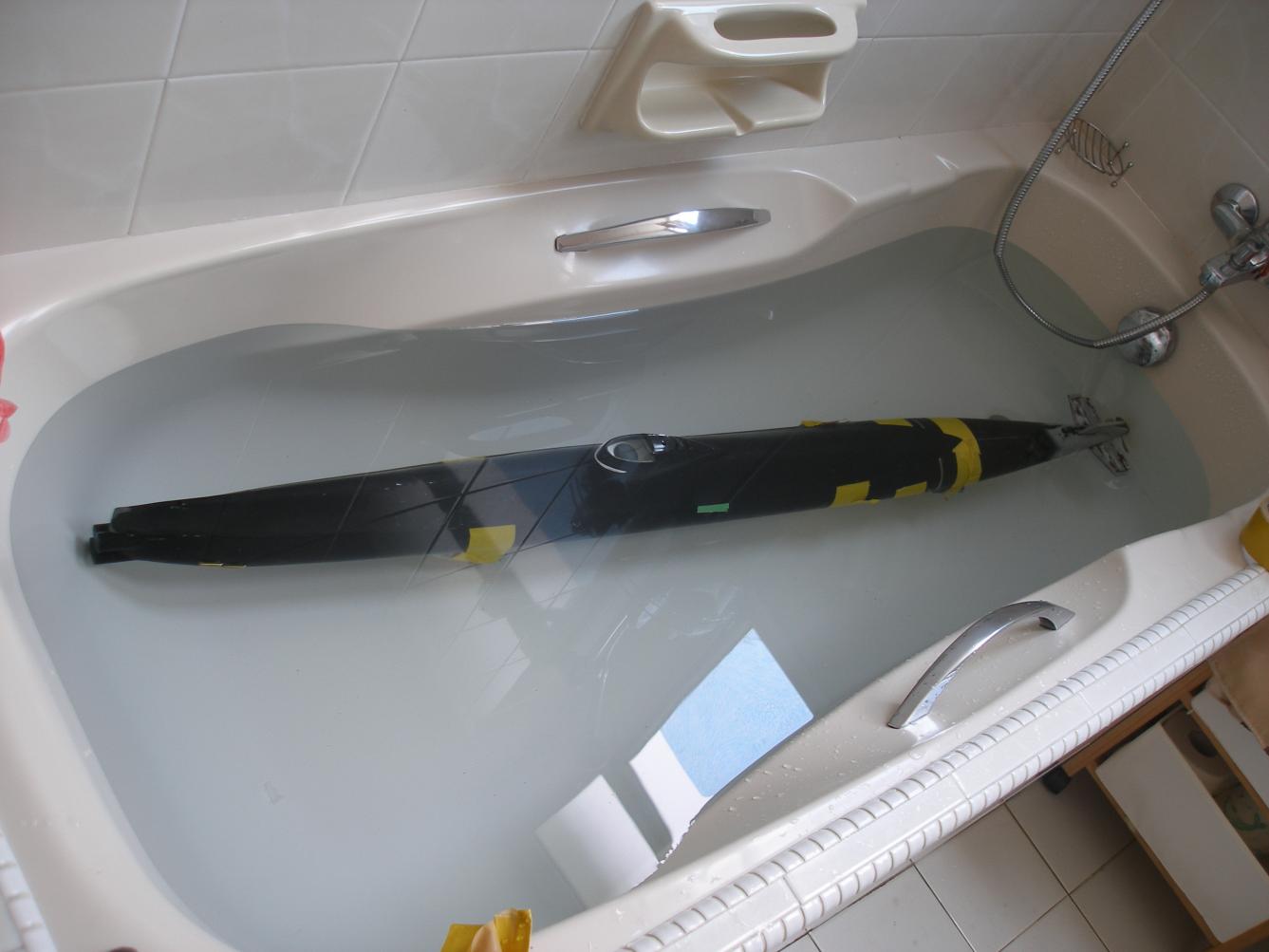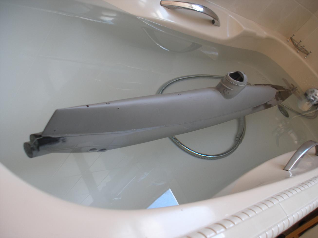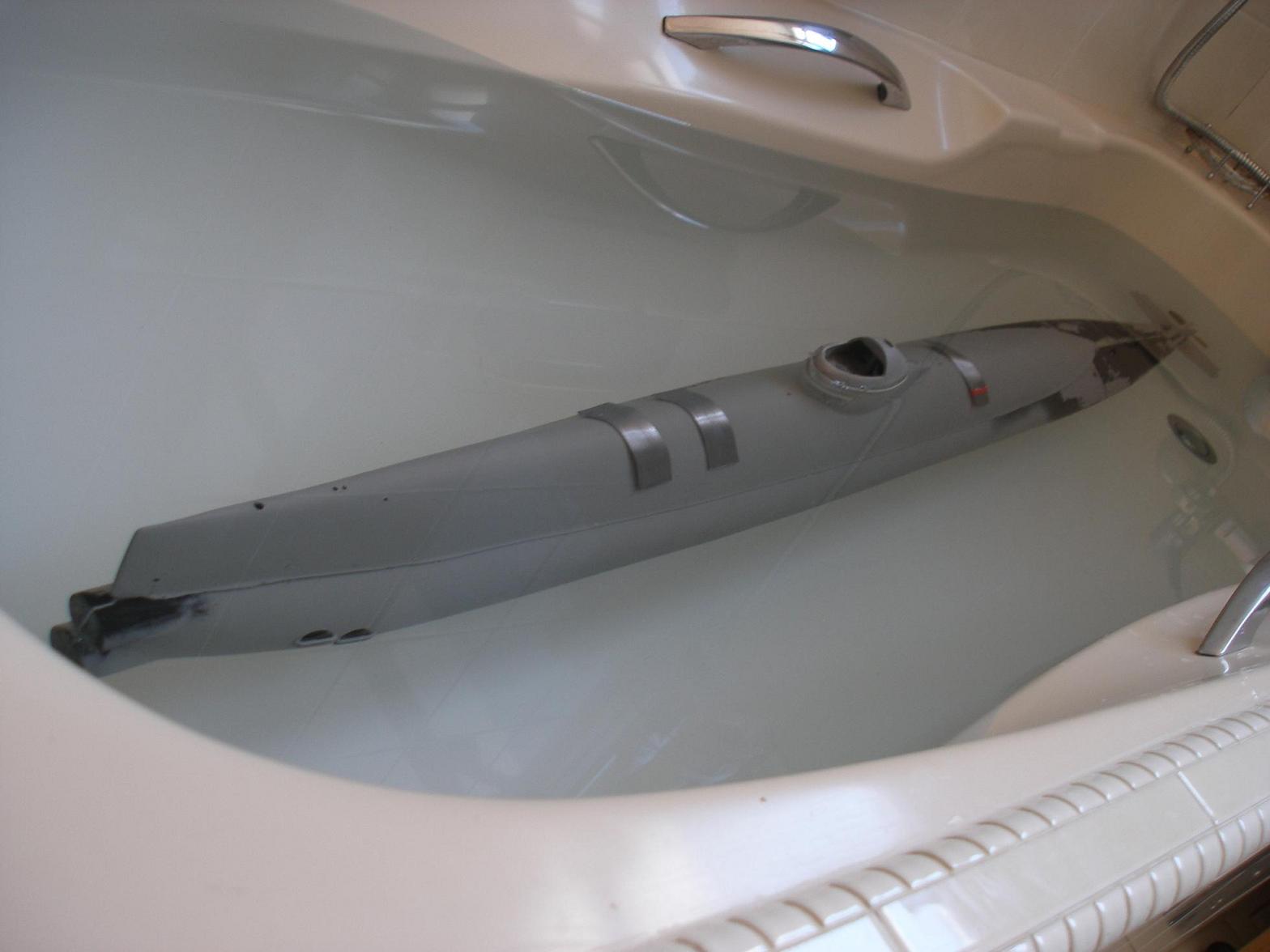 Gantu was selling these on behalf of German guy, so I think it’s a relatively limited run. With limited flood vents and drains plus the fact most of the hull stays submerged, the design lends nicely to the German style of dry hull, and so that’s the route I took. Included with hull was a CD with photos showing another hull already built up including the tech rack, which was integral with the rear hull. I had concerns over how much weight was hanging on this and therefore how strong the rear bulkhead would need to be. Secondly I wanted to use the tech rack in multiple boats if necessary in much the same way that a wet hull WTC can be swapped between boats. The existing boat used a single piston tank, which is not a big issue with this model as it is not a conventional submarine, sort of pivoting around the propeller, so rising and falling at angles is not a problem.