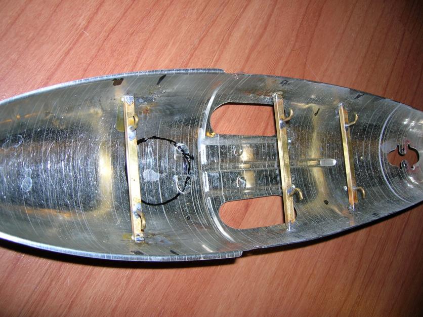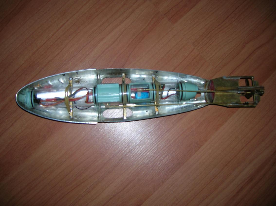 I soldered some brass channel for supports with rubber band hooks. A dual servo box seemed easier than trying to fit both servos in one box. A built in 3:1 reduction from motor to prop would be nice and the only thing I would change in the whole 1.25 in. system from Caswell. It is user friendly and versatile, worth the small investment. Next, a gray paint job and some flotation and she'll be ready for trials.Last edited by redlite; 12-05-2010, 12:05 AM.Comment