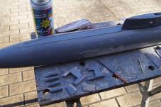 The photo's show the complete rear surfaces simply stuck on with plasticine for now. It is good the see how the overall boat will look. I am going to etch the outline of the root fillet of the stern planes onto the hull so that locating them is easier.