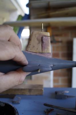 The bottom rudder , like the top has a raised section that will make location of the rudder easier. This was done by simply sanding a small piece of fig and gluing it down to the hull, filling around and sanding back.