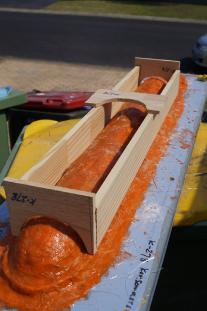 Once done I mixed up a thickened coat of resin with talc and some orange pigment. This is simply the gel coat that will capture the detail. Once again this mould would be orange and feature hard wooden egg crating like on the top half. Increases rigidity and strength and uses less resin. As mentioned I find making these large moulds tedious, hot and tiring work but I can see light at the end of the tunnel. Once I have enough layers of resin and cloth down and can place the egg crate structure on I will be able to separate both halves, pop the master out and reveal whether the moulds are what I expect them to be.
