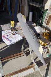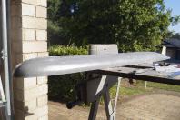 There were a couple of extra spots where the silicon was a little thin and there were depressions in the side of the hull. Fortunately these were reasonable small and a small amount of sanding and filler would fix these. Just a bit disappointing however that I can't pop out a nice near perfect hull half. I ground out a little area of the hardback behind the silicon mould where the weak points and tare were, then I filled thickened silicon in between the fibreglass hardback and the silicon mould. Then I pressed the mast hull in as best I could and waited.