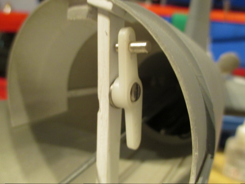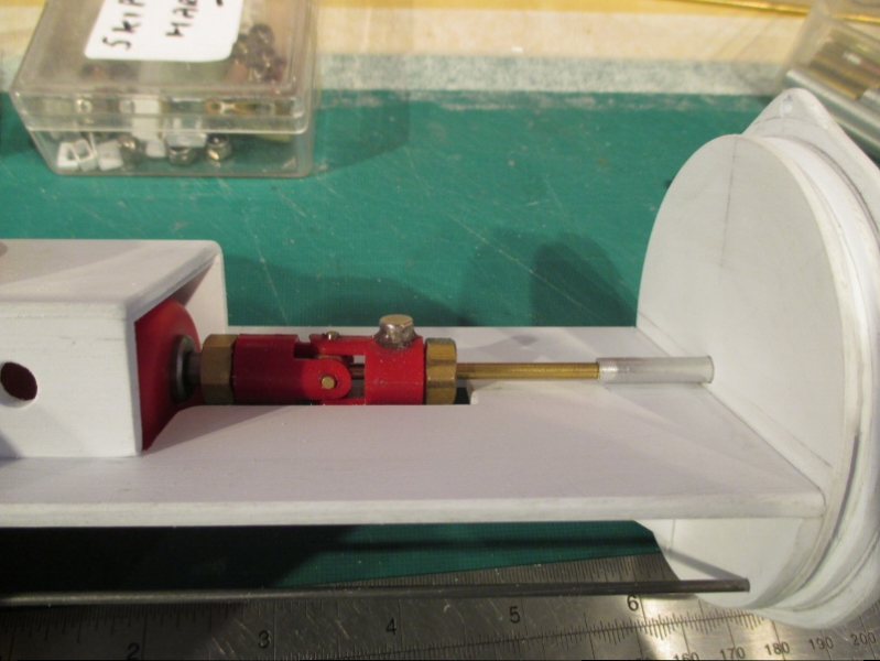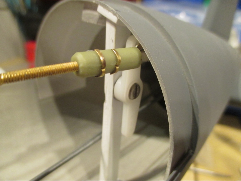 This fitting can now be sorted, it will carry the throw of the dive plane servo, reversing it's direction out of the WTC. It's held in place by these styrene fittings, one at the bottom of the hull another at the top.