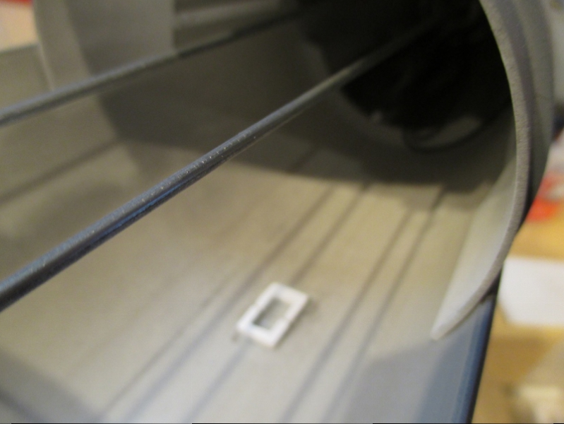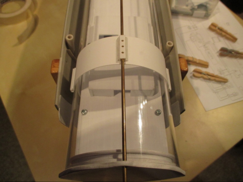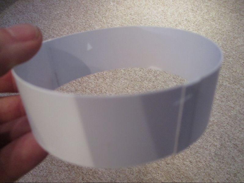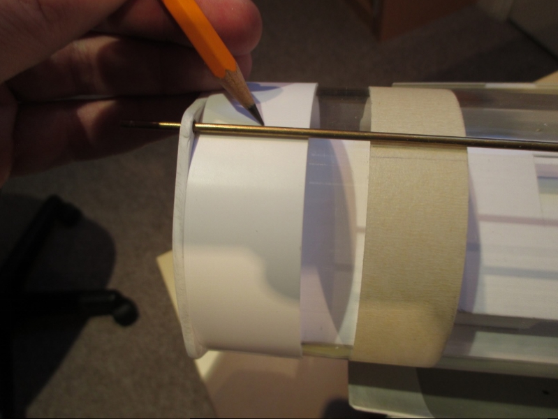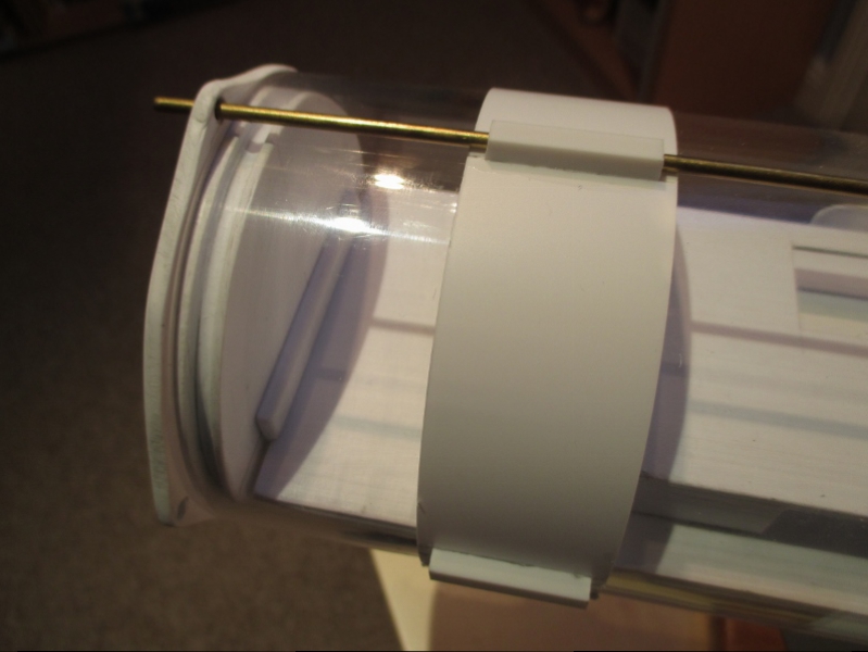 A collar of 0.5mm styrene, 3cm wide to the outer diameter of the tube is made. The position of the outer compression rods are marked, the collar has to be so thin so it will go under the retaining rods.