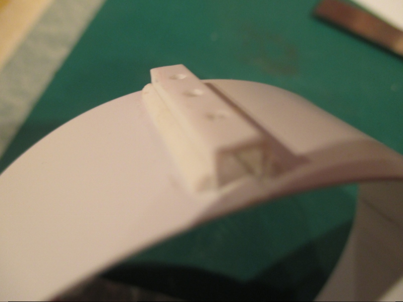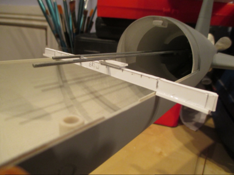 A stuffing tube (3 inch, the shortest I could find) is pushed into the shaft hole, a surround of styrene is filled with epoxy to seal the joint. Not my neatest work, I'll be filling and sanding this later.