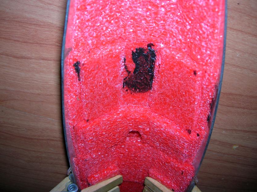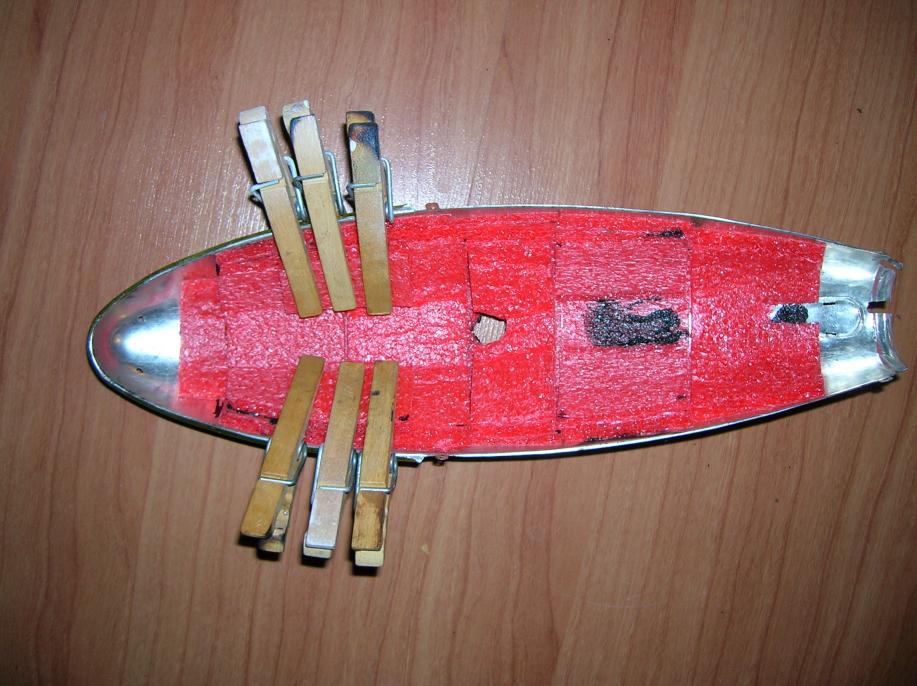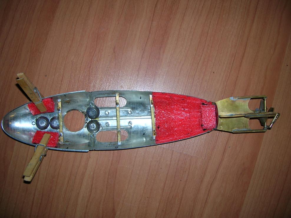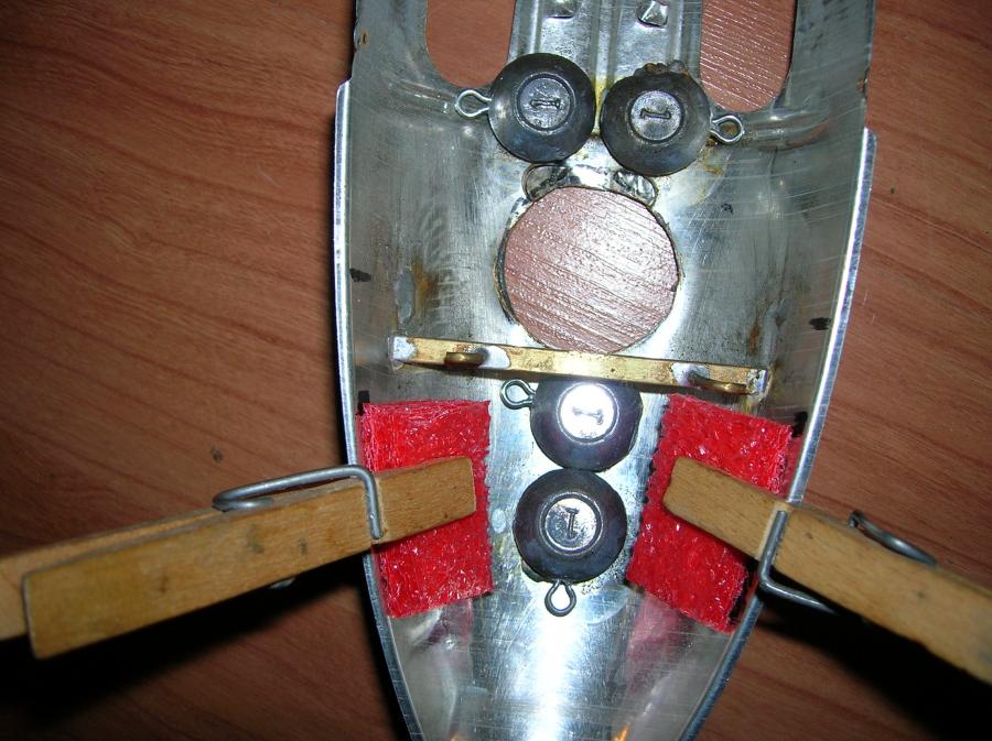One ounce lead weights were soldered to the bottom inside of the hull once their proper position was determined. Hole for access hatch can be seen next to lead weights.