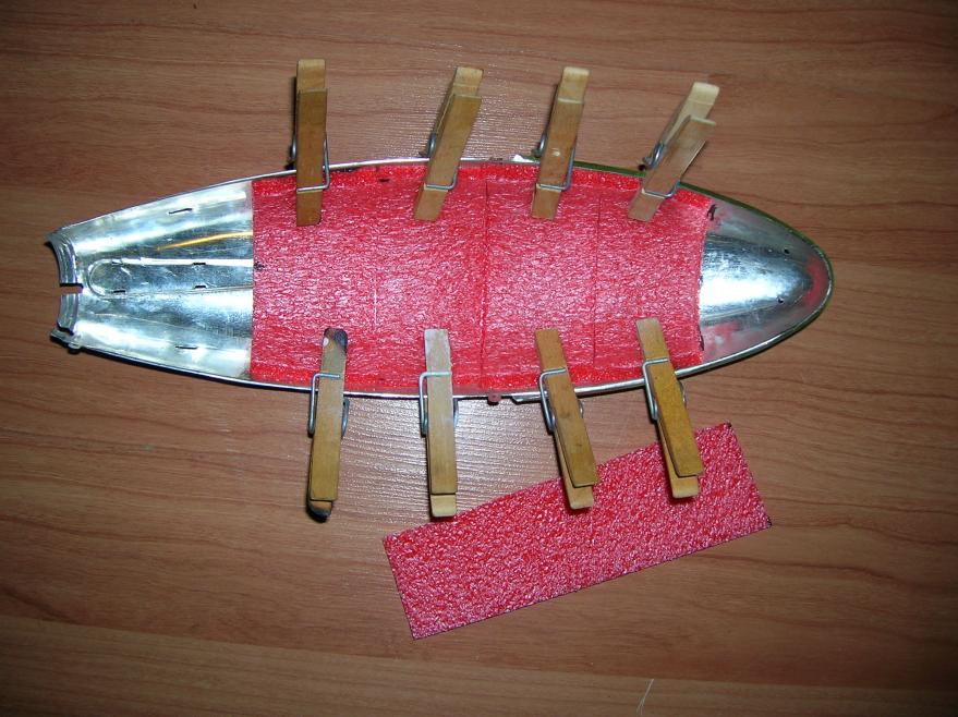 I still needed to add flotation after the Sub Competition ended. I used some closed cell foam designed for the marine environment. I've never been happy with the blue foam that I've been using for years. It's not really designed for submersion and as it gets older, the negative properties magnify. Problem solved with this stuff, as it is more flexible and can be easily conformed to any shape. My Holland is all compound curves, so this was a great test vehicle. I needed to get the foam tight up against the top inside of the hull due to lack of usable space in this tiny model. Layers were glued with 3M 4200 Marine Adhesive, great stuff, though a bit expensive and messy.