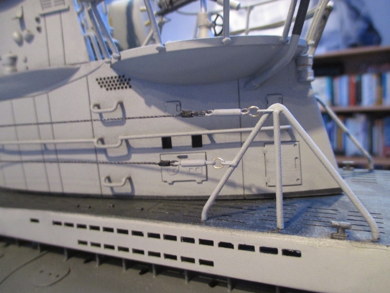 The single forward aerial is made with the split to each side of the tower, and the looped centre line to the fixed tensioner in the tower is made with a small length of elastic thread.
