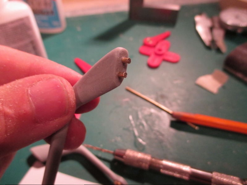 Two corresponding holes are drilled in the red prop shaft holder and then one more pin added to the end of the support going into the hull along a straight line drawn from the rear dive plane connecting rod (now also round).