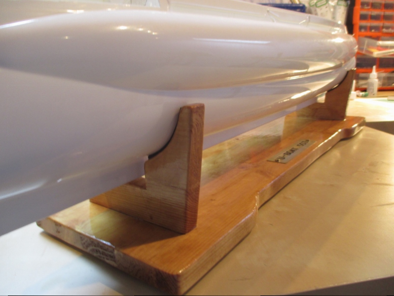 U557 gets my basic boat stand, just project timber and some oak varnish with computer mouse mat strips for the sub to rest on.