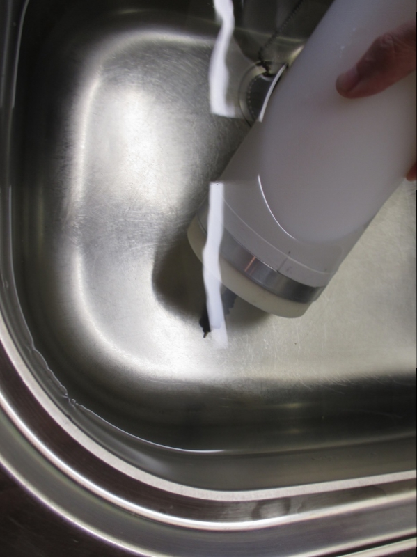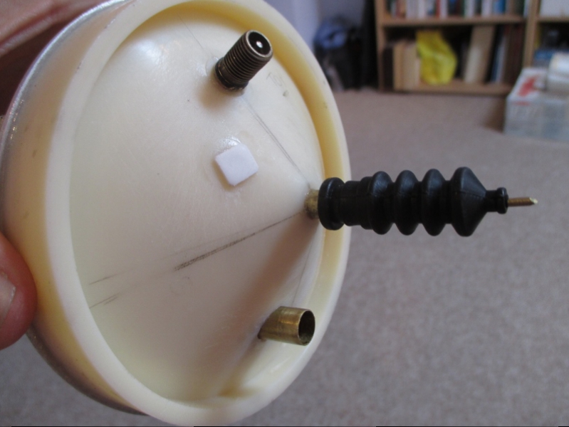 To simulate a full piston tank and the pressure the air that was in it would create in the WTC, here is the bayonet lock end in the sink with 25 strokes (25 X 100ml) of air, more that a good safety margin and no bubbles from the lock, in fact I kept pumping till the bellows eventually failed at 32 strokes!