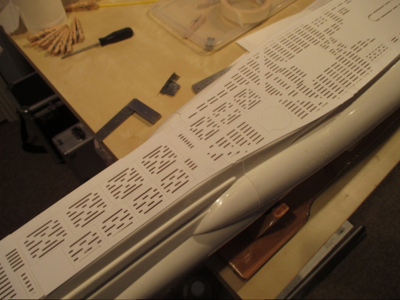 Middle and forward hulls are bonded together by standing one on top of the other and using a length of elastic string to ensure they are straight, the fit is so good nothing is needed to hold it all together, one of the kits good points.