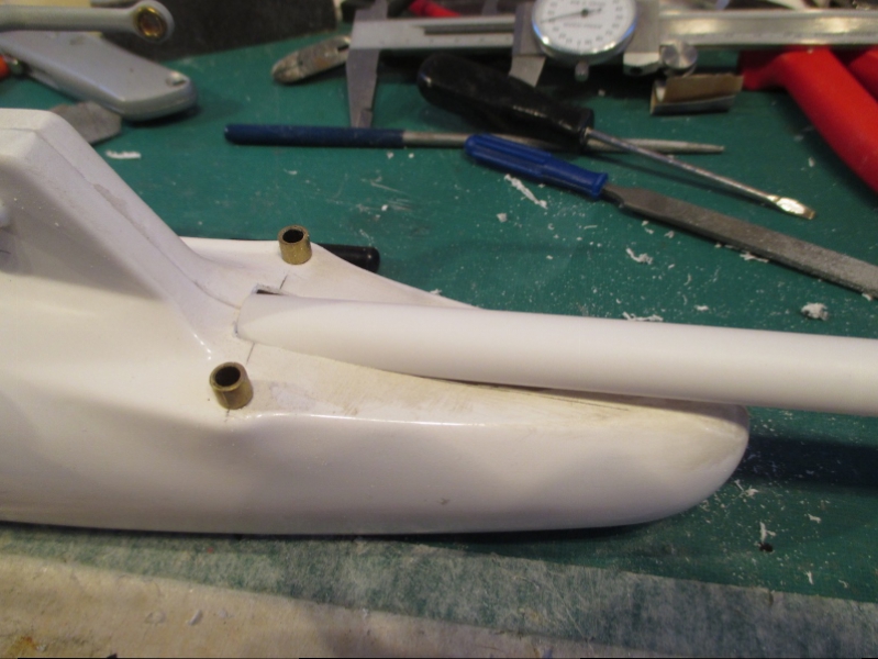 The prop shafts are now set in line, the photo below shows the difference with the kit prop shroud and it's new location.