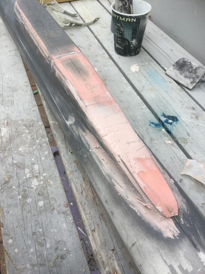 As you can see I also pasted some filler around the sides, now needing to make sure that the radius of the hull curing up to meet the deck was consistent on both sides. I also carefully put some filler into the