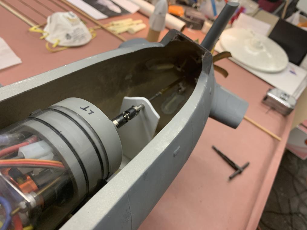 The prop shaft support bearing in inbound too and fill be fitted to that bulkhead. I had to make a new one because the first one made it impossible to have easy access to the control yokes. It at it's furthest point forward which allowed me to tighten down the grub screws. It's tight back there.