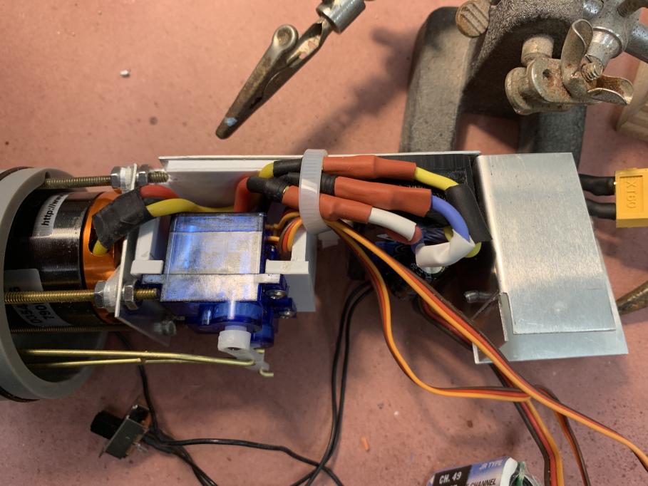 First I shortened the motor leads and added bullet connectors. Yes I know the servos are not in the correct position. I fixed this later.