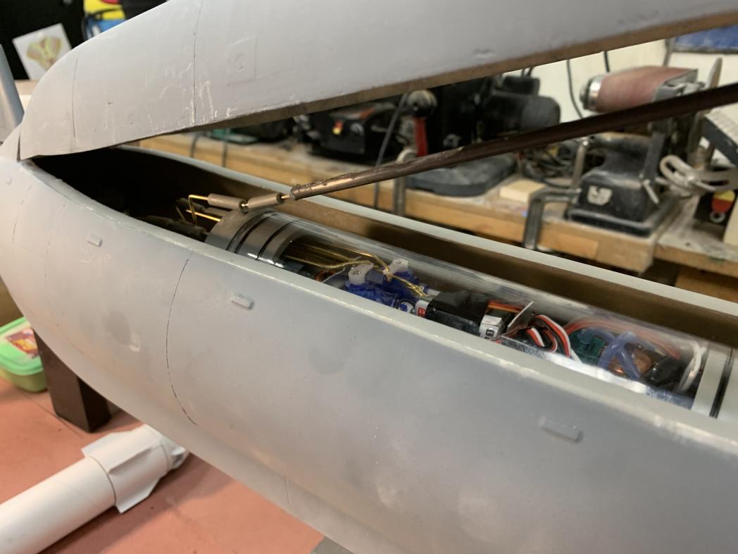 The WTC has two servos in the front. They are forward of the planes. I have two choices. Run a long shaft from the aft dives planes control to the bow planes or bend backwards 1/16 wobbly wire on magnets to the forward control shafts. I tried that. It works but it's kinda of funky. As you can see in the picture I have this bent control shaft. It's a temporary and it works. If I go this route I will use it as a pattern to make some a bit more palatable to the eye.