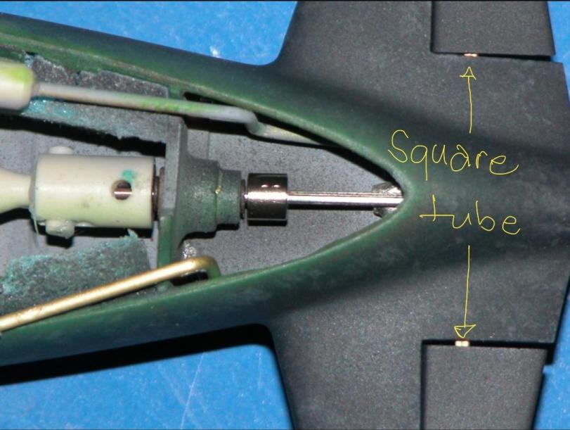 The square rod rotates about as well as traditional round rod in the bearing surfaces; provides a 'flat' for the pushrod control-horn set-screw; and provides a 'flat' for the set-screw set within the stern plane/rudder holding the operating shaft firmly in place within the control surface.