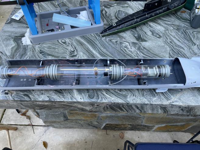 Well I took a little break from sanding to almost complete my first RC sub. Its a Kilo from Bob with all the bells and whistles. Running gear is in and working just waiting on a package getting here on Friday to connect the prop shaft.