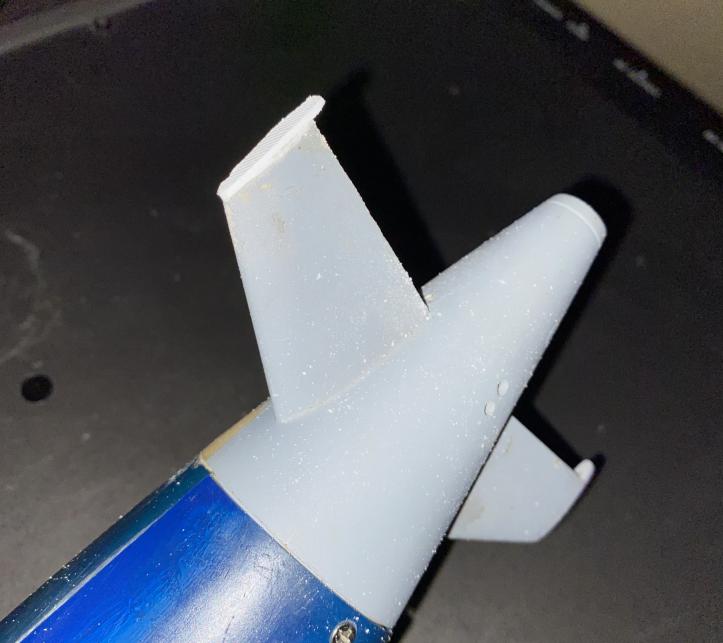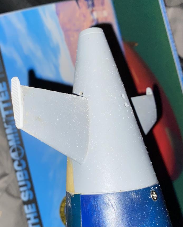 ID:	153914 Thanks, guys. I sanded off the end of the dive plane so what I added would be even with the other side. I then glued a piece of .040 sheet of Evergreen plastic backed by a small strip of .015. Sanded to shape and coated with some spot putty. All done.