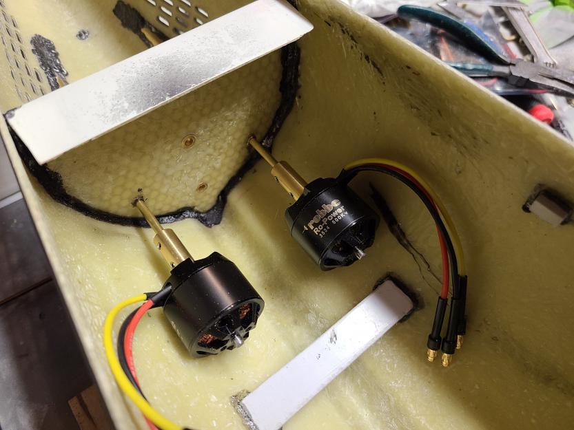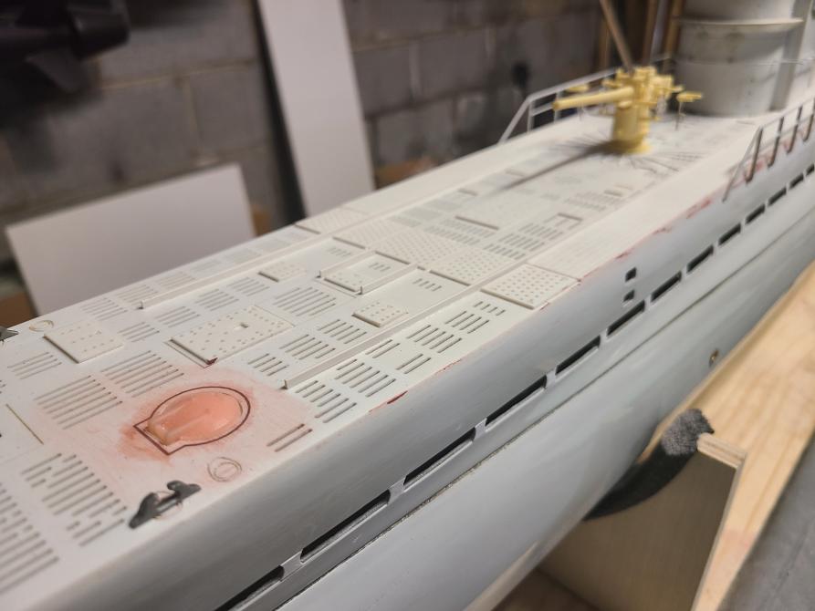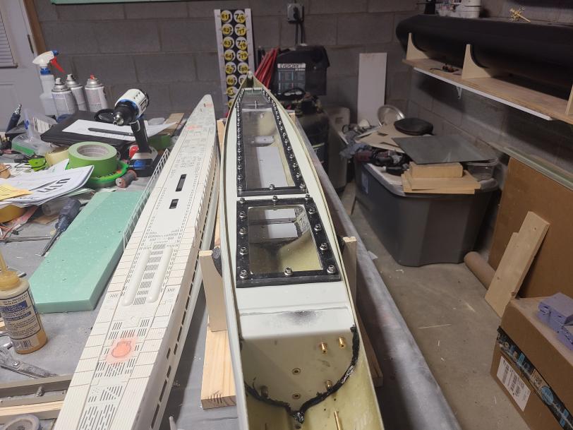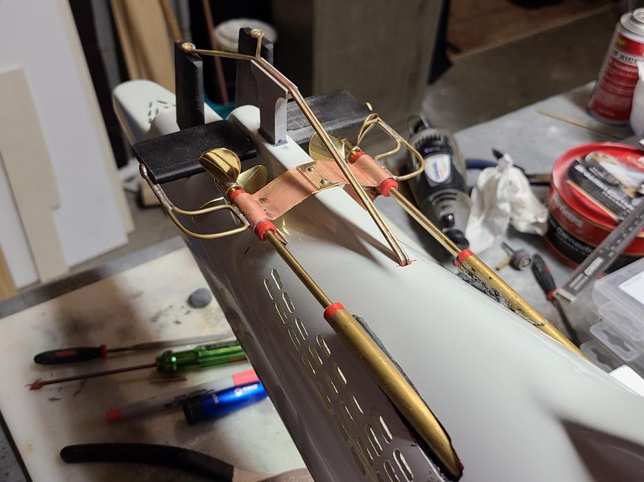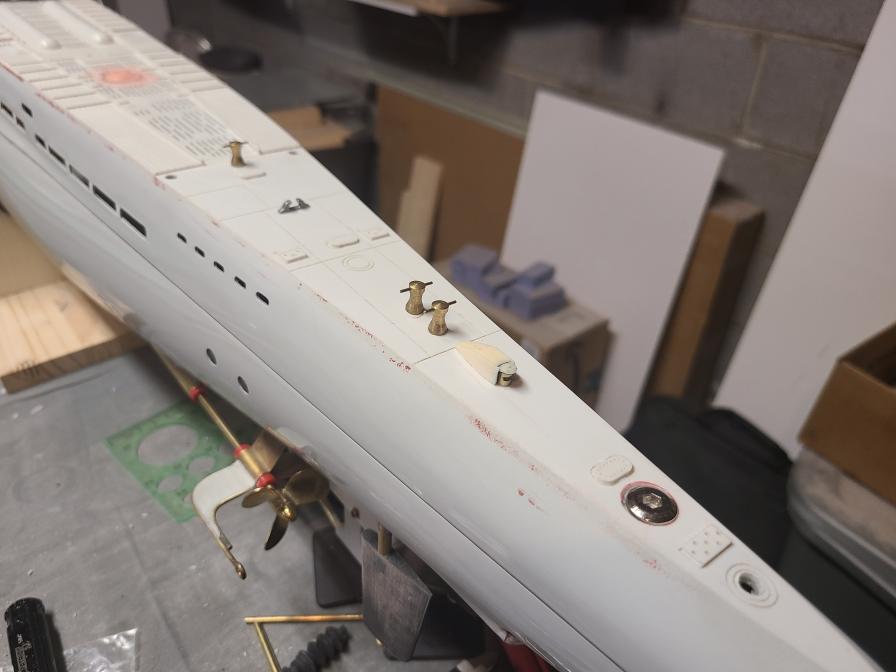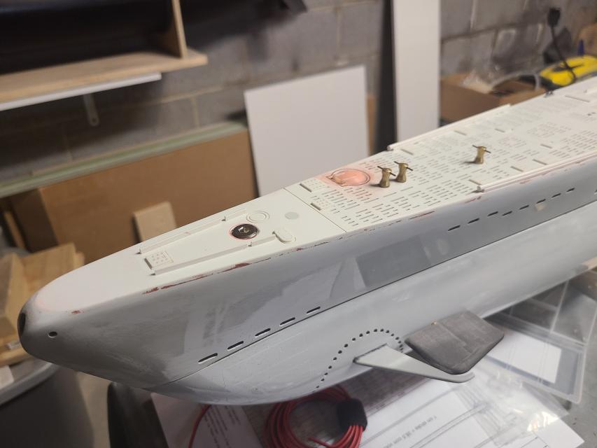 I got the gaskets made for the middle deck hatches and the bolts to secure the upper deck to the lower deck are installed. The middle deck is still not secured yet but the seam between upper and lower decks is actually not bad. I also feathered in the styrene decking to the upper hull with some Evercoat Rage filler and added the final detail bits to the deck including an anchor light. Try as I might and even with good alignment I was just not happy with how the brushed motors secured and connected to the drive shafts. As a result, there was too much drag in the system to be reliable so after talking it over with David we decided to go with a set of the Engel 500kV brushless motors connected directly instead of the stock geared setup. This thing is very close to being ready for paint and it is looking really good.