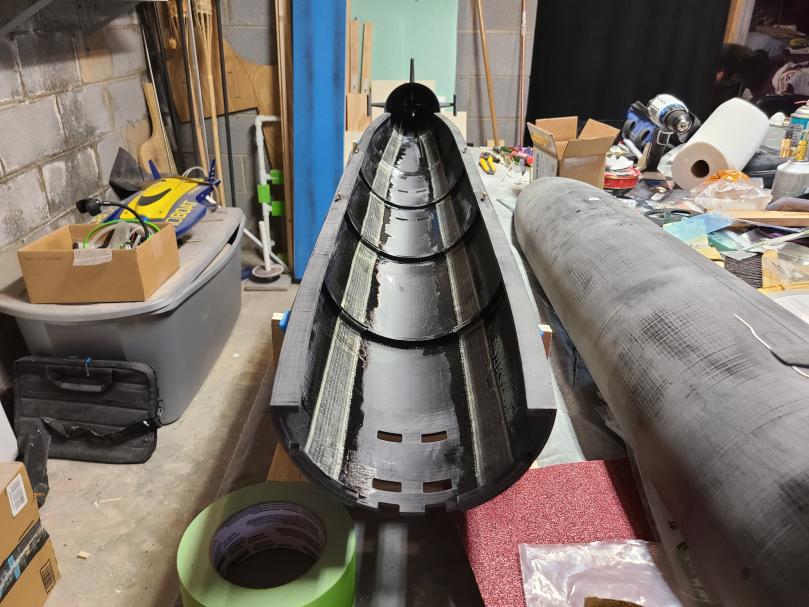 I added some strips of fiberglass tape to help add a little strength. This is the first time I have tried this. Another option could be adding some carbon fiber cloth which would really stiffen it up if needed. My plan is to get a coat of primer on it tomorrow.