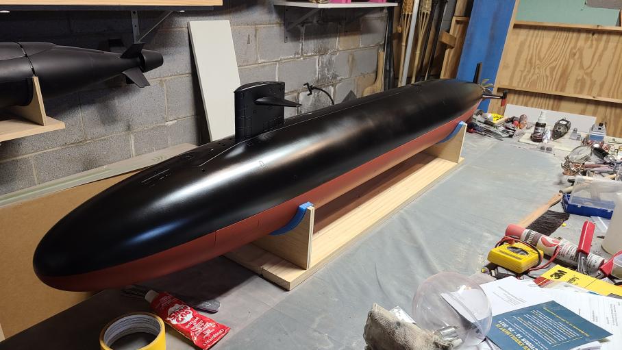 Some color being applied. Once the graphics are on I will give it a clear coat of matte. My guess is that before that fateful final voyage the Navy had her all gussied up and outfitted with the latest greatest bells and whistles so it wouldn't have had much of a scum line or need a bunch of weathering? Thoughts?