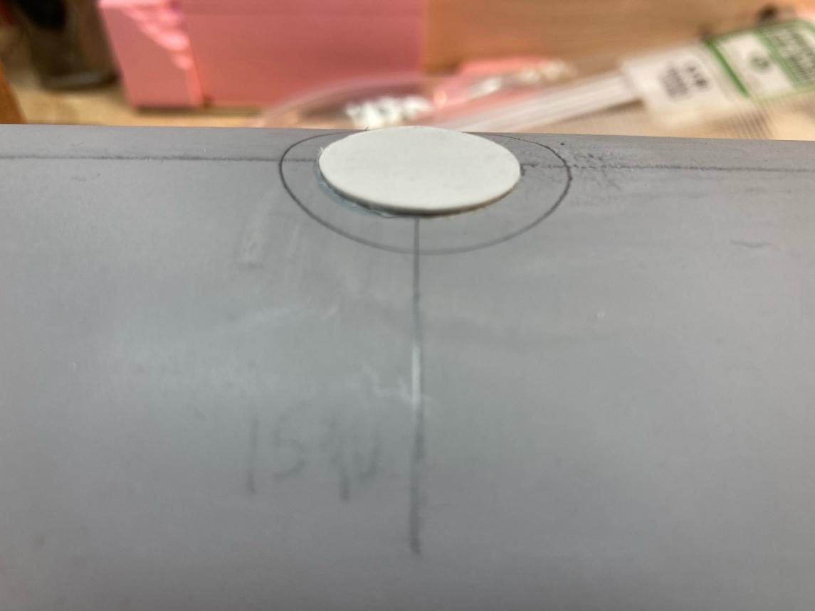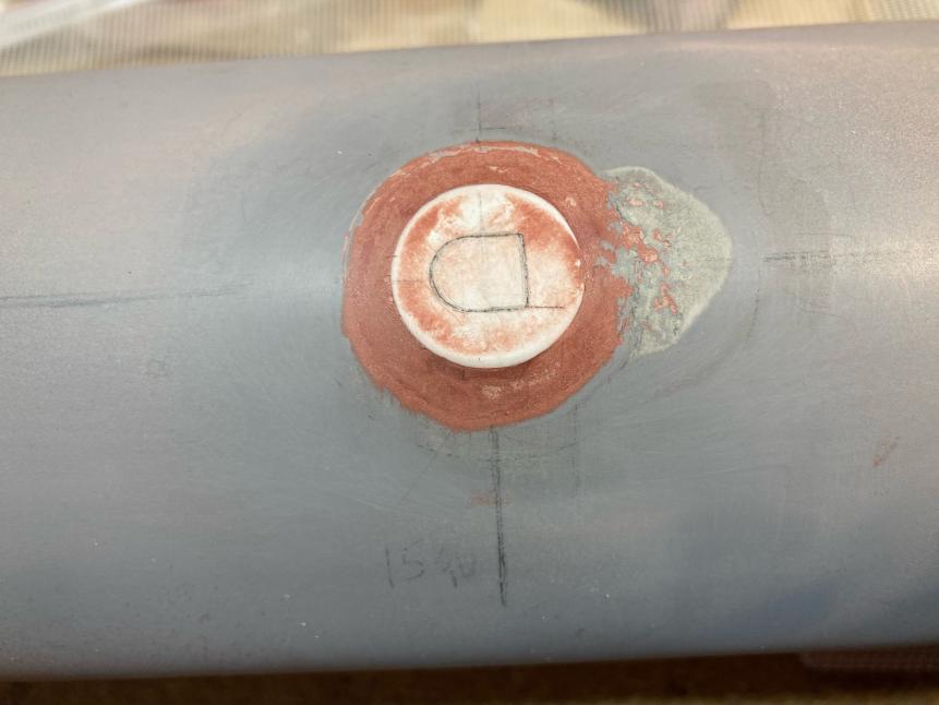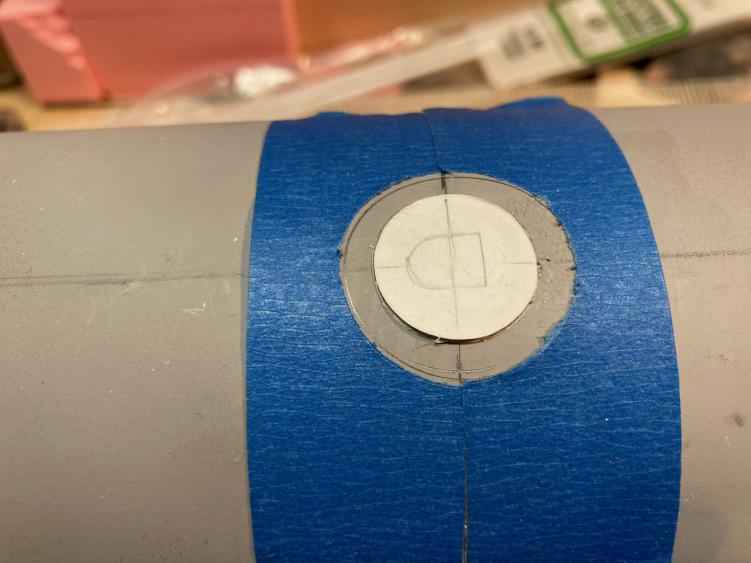 I used a Forstner bit to create a flat indent on the hull for my polystyrene hatch plate. Then masked around the hatch plate and filled in with glazing putty. Next I sanded around the plate to get the contour with the hull. Hopefully this will look close to the real thing once I get the final coat of paint on the model. That will take awhile as I still have a lot of work to do on the hull before getting back to the sail, rudders and planes.