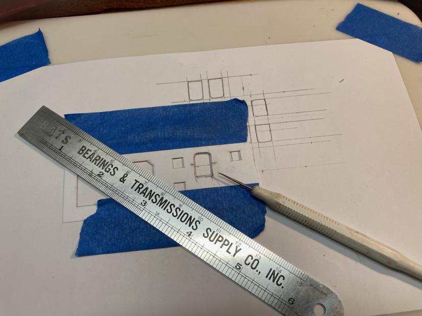 Scribing the fairing covers for the Vertical Launch System has been a challenge. I haven't done any scribing since the Kilo I did several years back and my eyes aren't as sharp as before. I found some templates I used on my Visitor III and tried them.