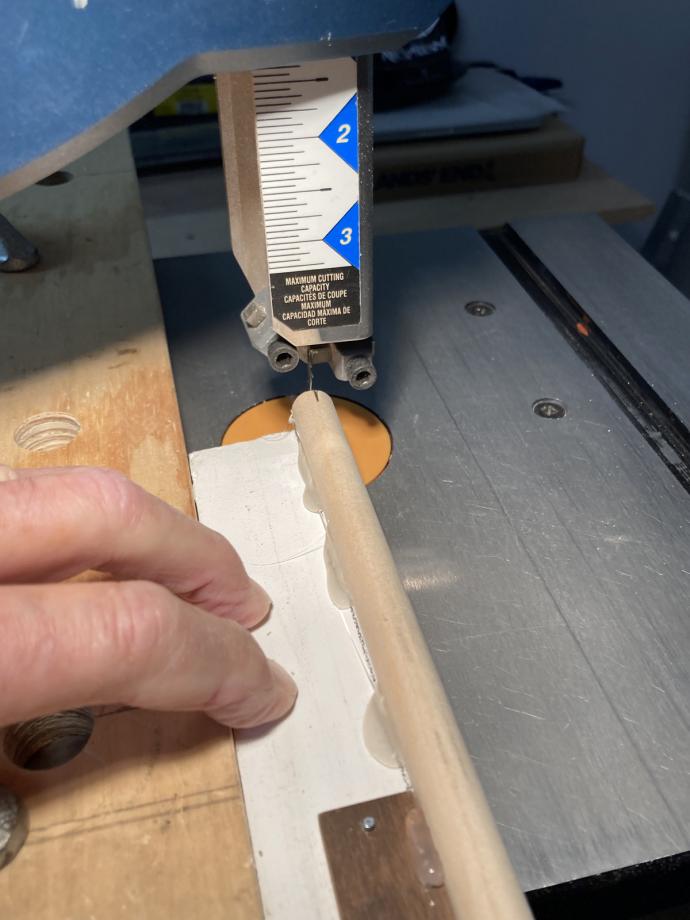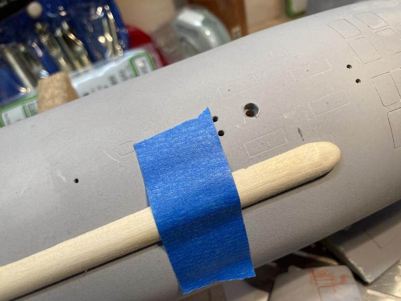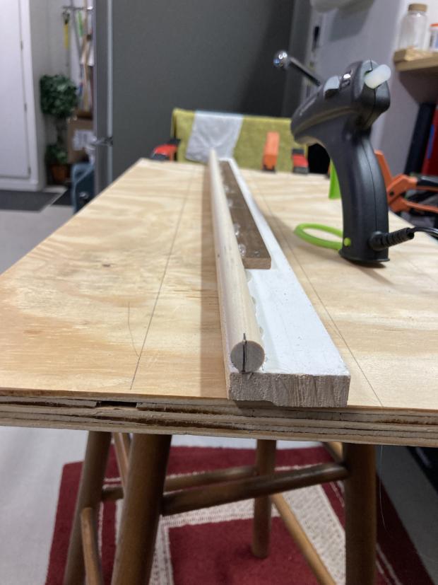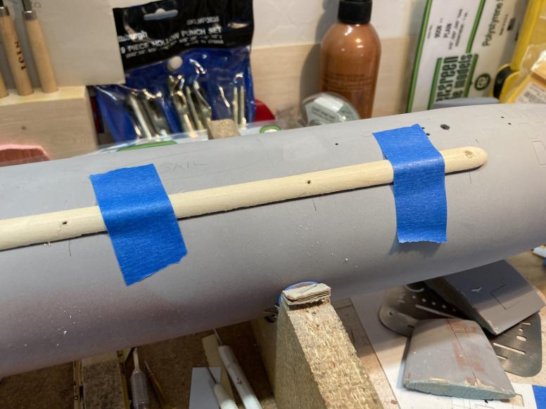 To add the safety track faring I started with a half inch dowel rod, drew a 3/8" chord for scale and mounted the rod to a jig with hot glue to hold it in place. Then I cut the rod at the bandsaw, shaped the ends and mounted it to the hull with blue tape for a first fit. The forth photo shows the placement was off by about a half inch at the pencil mark so I moved the rod back, re-taped it and drilled pilot holes for nails. The next step will be to secure the rod in place with epoxy and nails. There is a lot more to do but our garage is still a bit cold so the work progresses slowly. Oh, hope you don't mind the messy work bench. It works for me.
