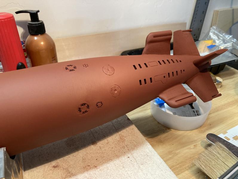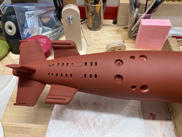 Some guys in Arizona are lucky to have AC in their garage, I'm not one of them. 105F yesterday in my garage so little or no work on Tucson. I did manage a coat of flat primer on the hull early this morning before it got hot. Until it cools off a bit progress will be slow but it is beginning to look like a submarine.